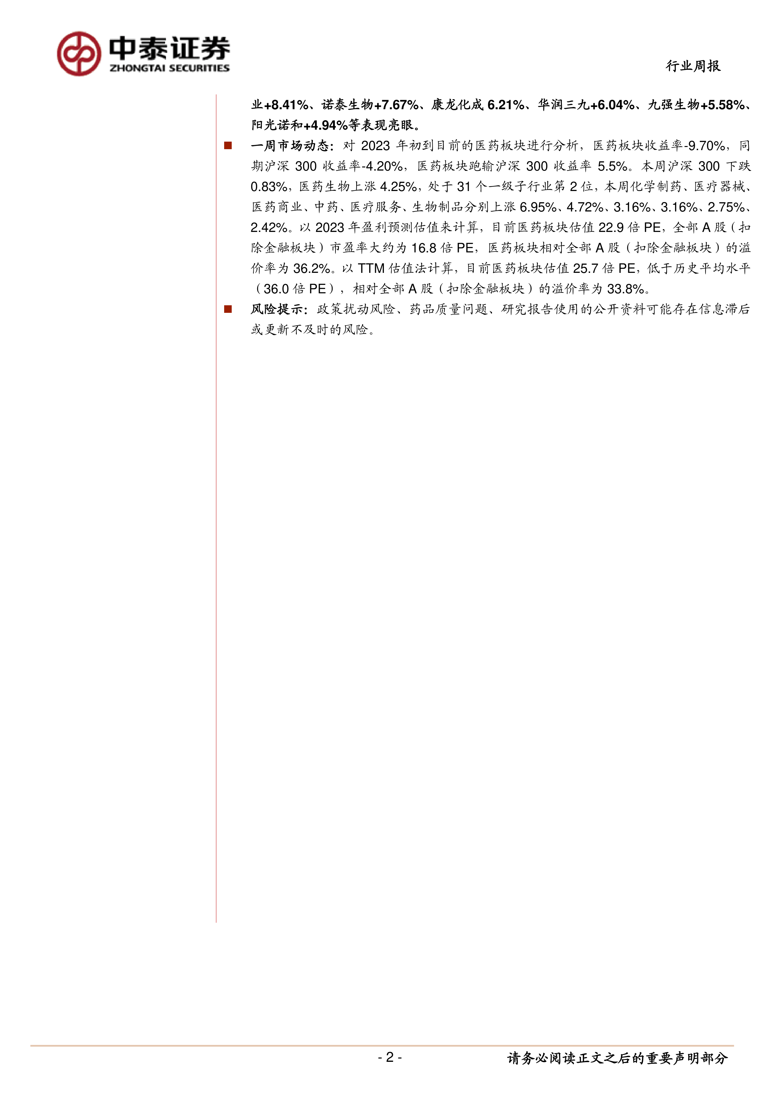 一周市场动态:对 2023 年初到目前的医药板块进行分析,医药板块收益率-9.70%,同期沪深 300 收益率-4.20%,医药板块跑输沪深 300 收益率 5.5%。本周沪深 300 下跌0.83%,医药生物上涨 4.25%,处于 31 个一级子行业第 2 位,本周化学制药、医疗器械、医药商业、中药、医疗服务、生物制品分别上涨 6.95%、4.72%、3.16%、3.16%、2.75%、2.42%。以 2023 年盈利预测估值来计算,目前医药板块估值 22.9 倍 PE,全部 A 股(扣除金融板块)市盈率大约为 16.8 倍 PE,医药板块相对全部 A 股(扣除金融板块)的溢价率为 36.2%。以 TTM 估值法计算,目前医药板块估值 25.7 倍 PE,低于历史平均水平(36.0 倍 PE),相对全部 A 股(扣除金融板块)的溢价率为 33.8%。