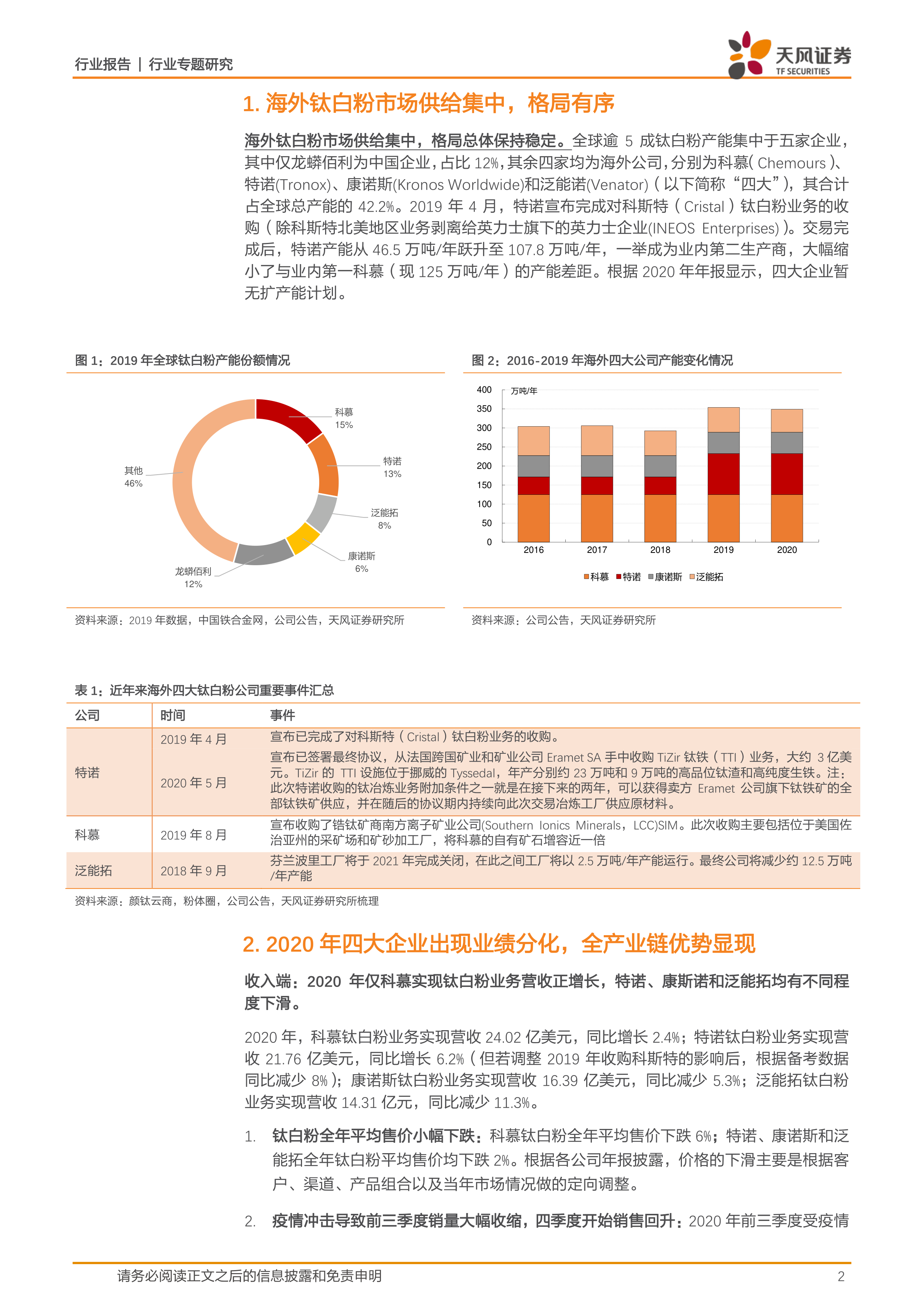 从营收端来看,2020年仅科慕实现钛白粉业务营收正增长,特诺、康斯诺和泛能拓均有不同程度下滑。其中,科慕钛白粉业务实现营收24.02亿美元,同比增长2.4%,主要系欧洲区域的市场份额重新获得所致。特诺钛白粉业务实现营收21.76亿美元,同比增长6.2%(调整2019年收购科斯特的影响后,根据备考数据同比减少8%);康诺斯钛白粉业务实现营收16.39亿美元,同比减少5.3%;泛能拓钛白粉业务实现营收14.31亿元,同比减少11.3%。2020年钛白粉全年平均售价小幅下跌,同时疫情冲击导致其前三季度销量大幅收缩,四季度开始需求显著回升,对四大公司全年业绩起到正向拉动作用。2020年疫情冲击下,仅特诺利润率有所提升(根据备考口径),主要受益于并购带来的协同效应和一体化优势。科慕和康诺斯亦拥有原材料配套,依托全产业链优势,利润率基本维持稳定。暂未实现向上一体化的泛能拓利润率则下滑3.3个百分点,主要系原材料(包括矿石成本)的大幅上涨导致其生产成本提升。