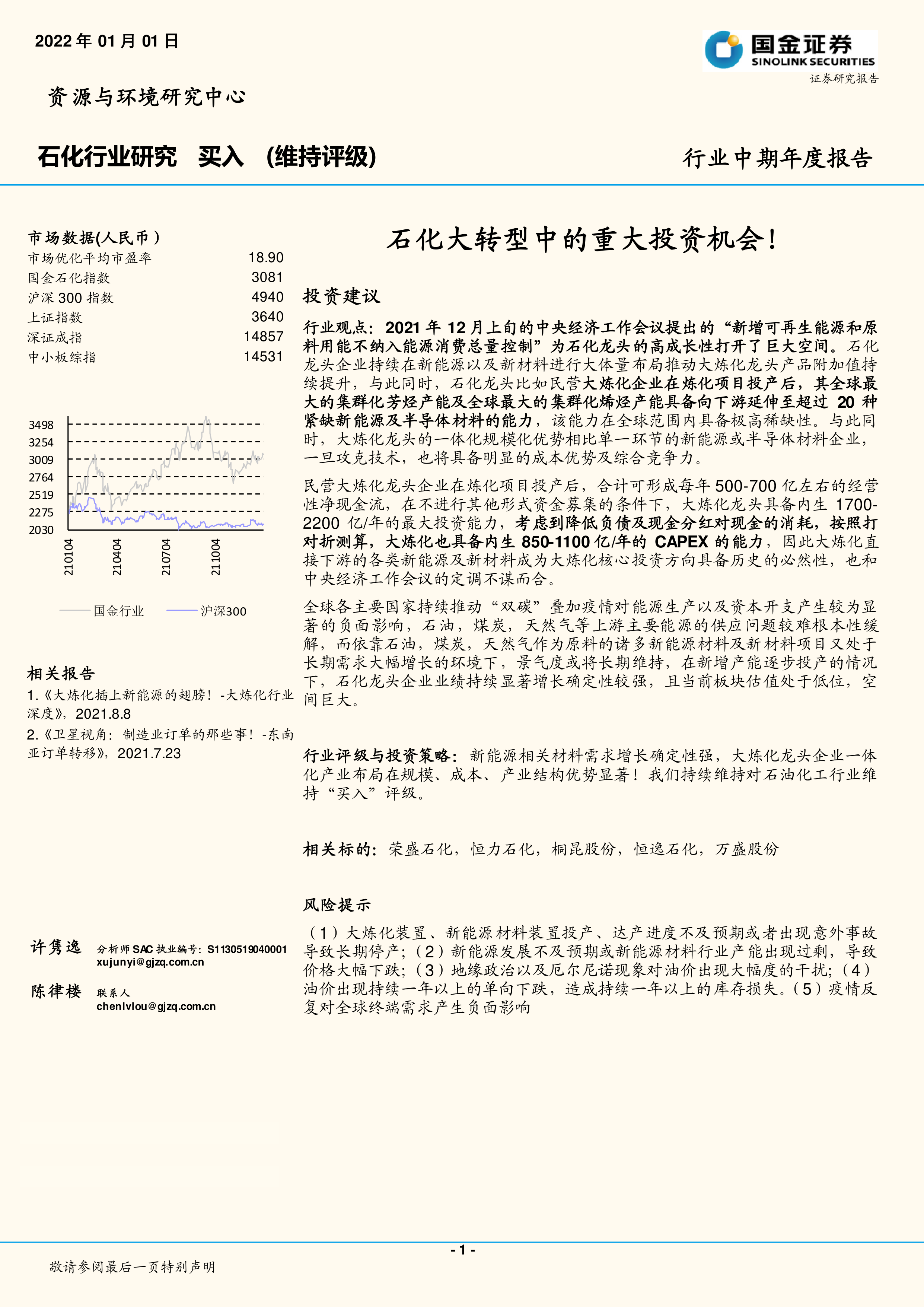 行业评级与投资策略:新能源相关材料需求增长确定性强,大炼化龙头企业一体化产业布局在规模、成本、产业结构优势显著!我们持续维持对石油化工行业维持“买入”评级。