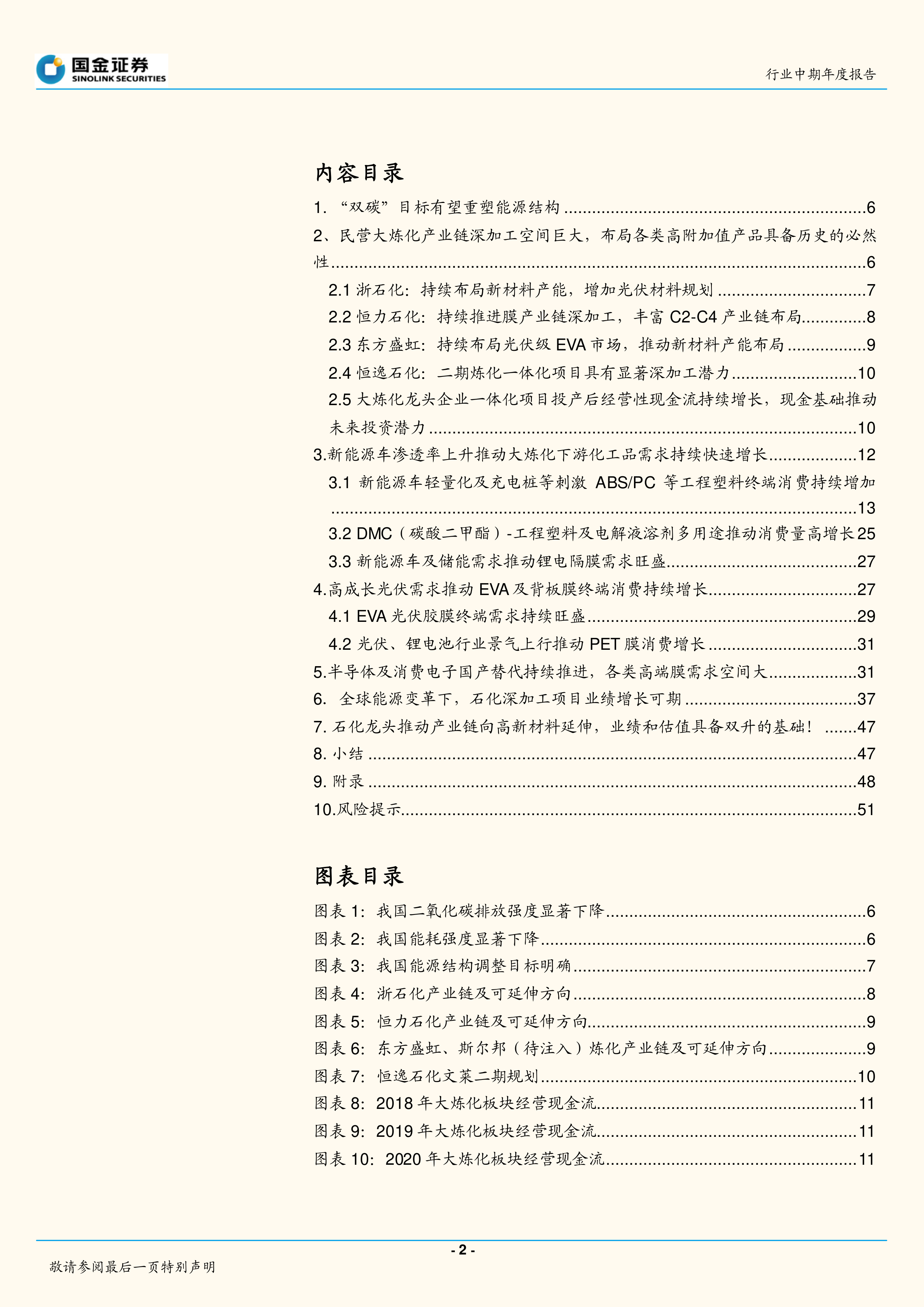 风险提示(1)大炼化装置、新能源材料装置投产、达产进度不及预期或者出现意外事故导致长期停产;(2)新能源发展不及预期或新能源材料行业产能出现过剩,导致价格大幅下跌;(3)地缘政治以及厄尔尼诺现象对油价出现大幅度的干扰;(4)油价出现持续一年以上的单向下跌,造成持续一年以上的库存损失。(5)疫情反复对全球终端需求产生负面影响