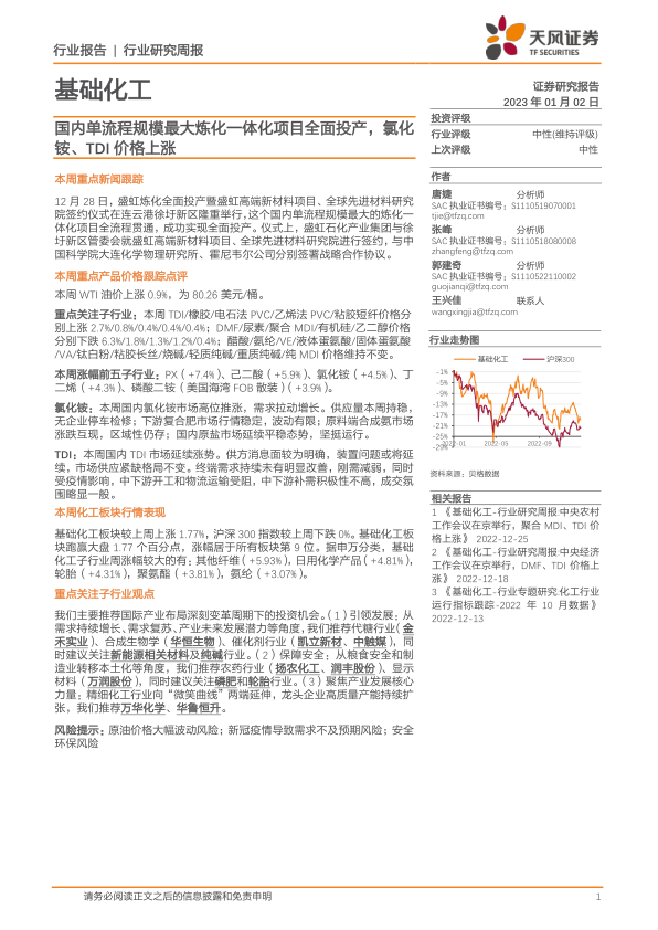 基础化工行业研究周报:国内单流程规模最大炼化一体化项目全面投产,氯化铵、TDI价格上涨
