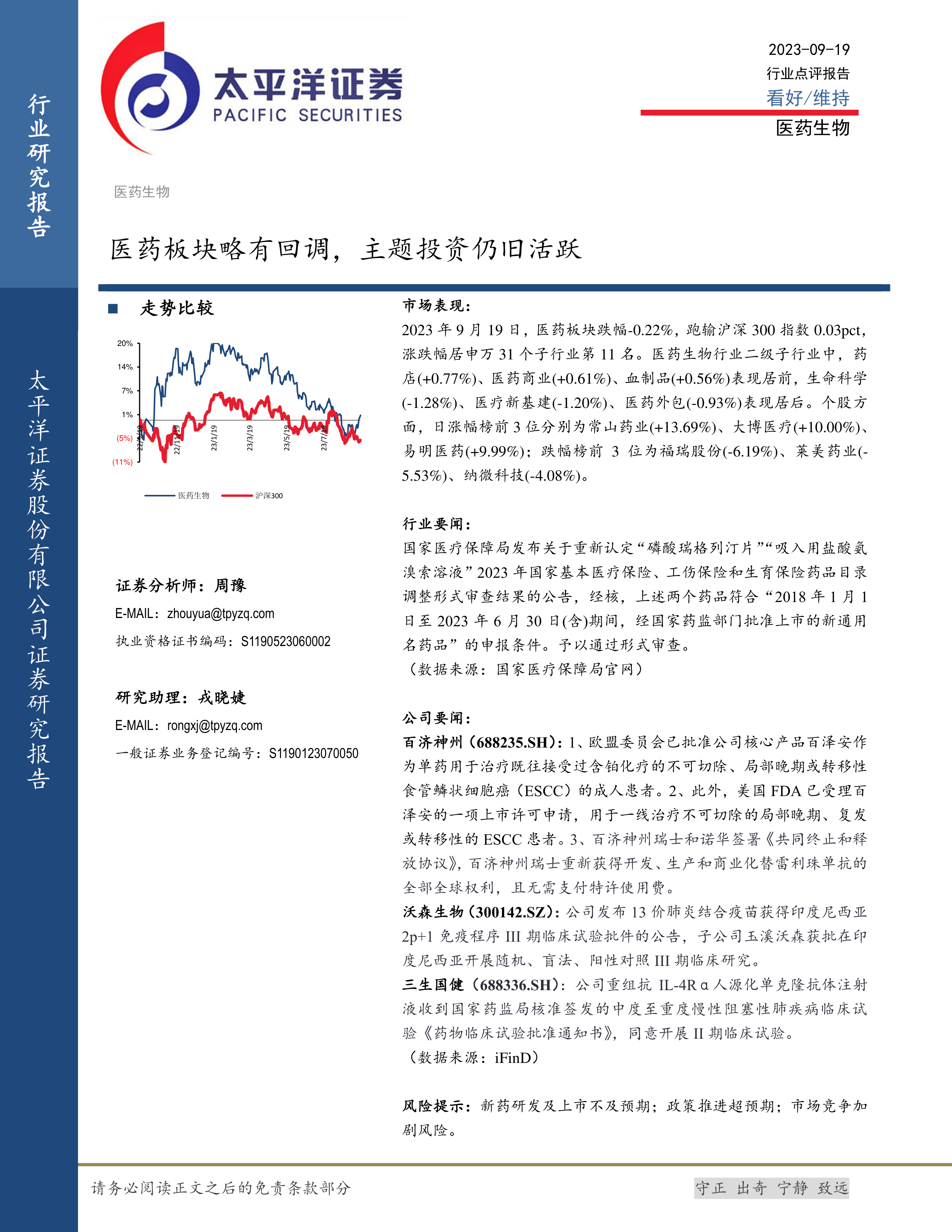 2023年9月19日,医药板块跌幅-0.22%,跑输沪深300指数0.03pct,涨跌幅居申万31个子行业第11名。医药生物行业二级子行业中,药店(+0.77%)、医药商业(+0.61%)、血制品(+0.56%)表现居前,生命科学(-1.28%)、医疗新基建(-1.20%)、医药外包(-0.93%)表现居后。个股方面,日涨幅榜前3位分别为常山药业(+13.69%)、大博医疗(+10.00%)、易明医药(+9.99%);跌幅榜前3位为福瑞股份(-6.19%)、莱美药业(-5.53%)、纳微科技(-4.08%)。