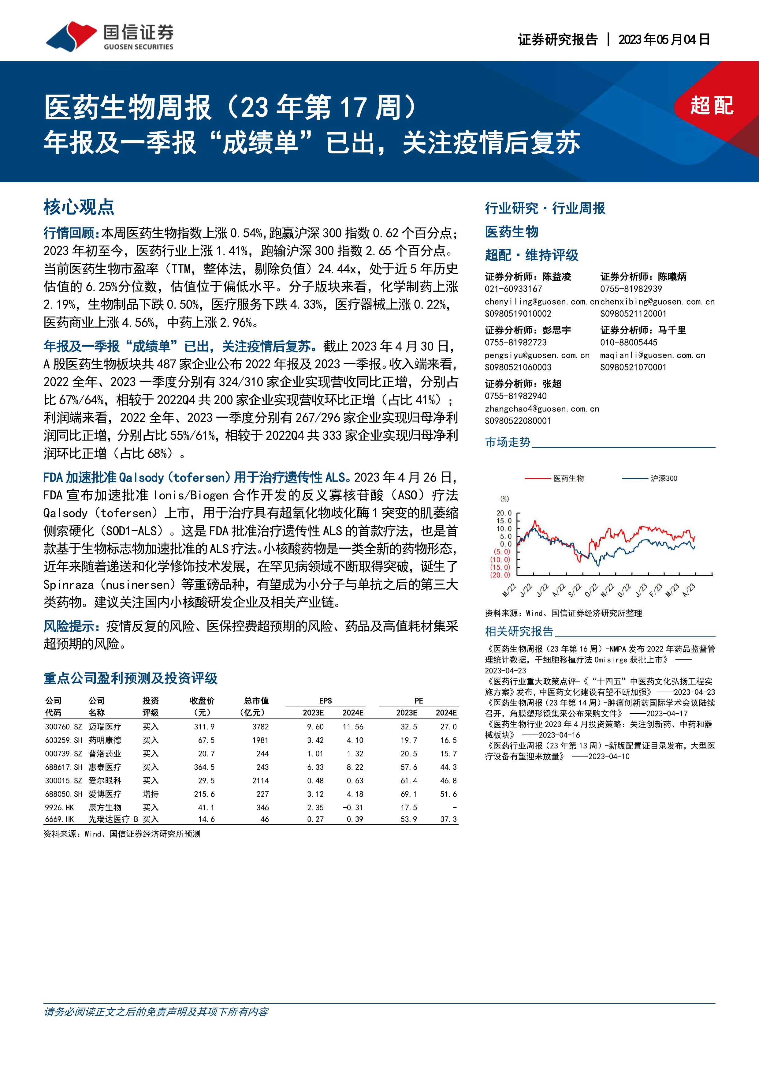 医药生物周报(23年第17周):年报及一季报“成绩单”已出,关注疫情后复苏