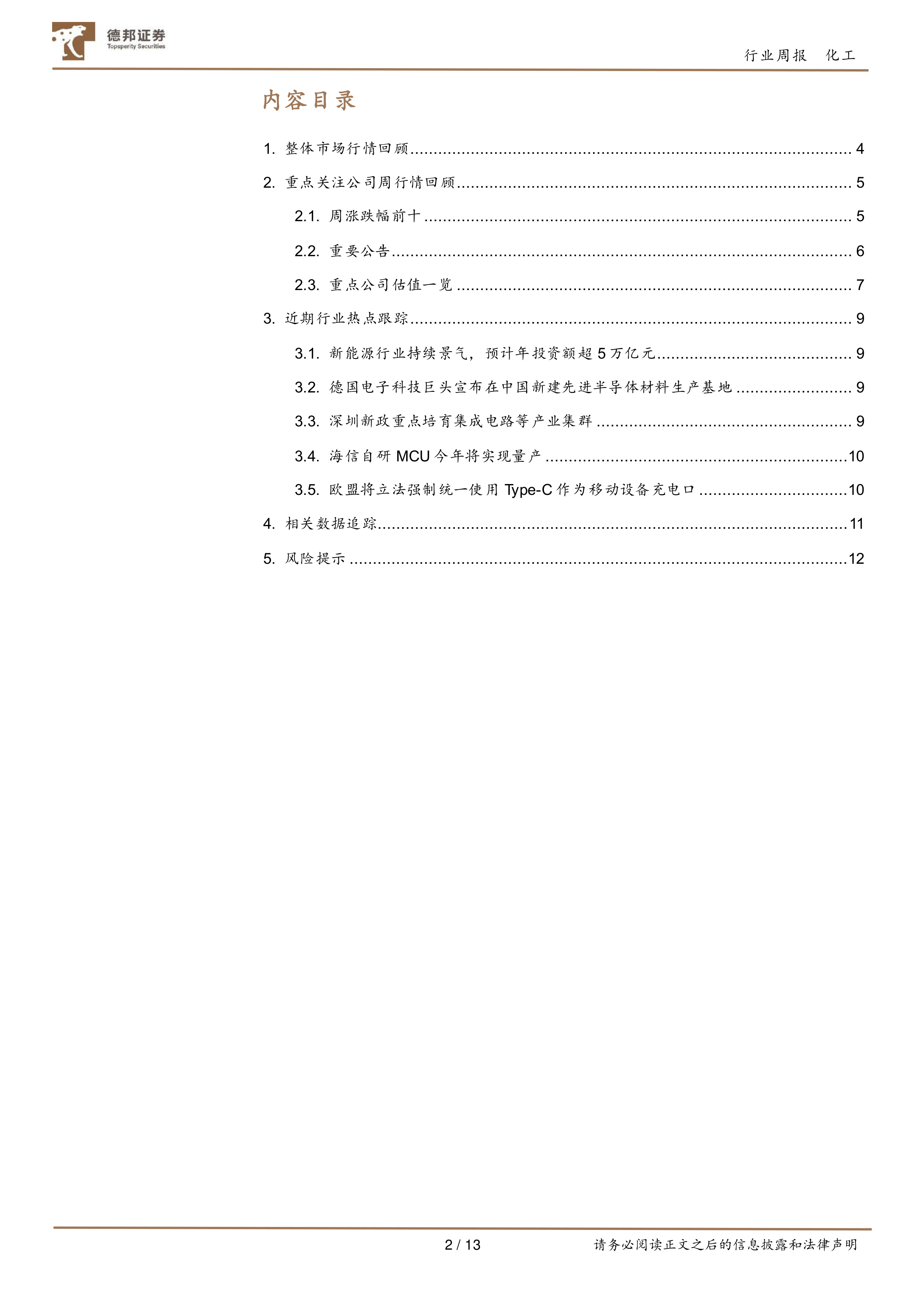 重点标的推荐:下游需求推动产业升级和革新,行业迈入高速发展期。国内持续推进制造升级,高标准、高性能材料需求将逐步释放,新材料产业有望快速发展。国内抗老化剂龙头利安隆深耕主业,珠海基地强化规模优势,收购康泰股份,进军润滑油添加剂市场,长期增长动力充足,建议重点关注利安隆。俄乌冲突爆发,稀有气体短缺,价格快速上涨,华特气体作为特气龙头,积极打造特气一体化销售平台,随着扩产项目稳步释放,盈利能力有望持续提升,建议重点关注华特气体。国瓷材料三大业务稳步提升,各板块业务齐头并进,受益于新能源材料旺盛需求,长期成长性显著,建议重点关注新材料平台型公司国瓷材料。电子化学品方面,下游晶圆厂逐步落成,芯片产能有望持续释放,建议关注:安集科技、鼎龙股份。碳中和背景下,绿电行业蓬勃发展,光伏风电装机量逐渐攀升,建议关注上游原材料金属硅龙头企业合盛硅业、EVA粒子技术行业领先的联泓新科、拥有三氯氢硅产能的新安股份以及三孚股份。