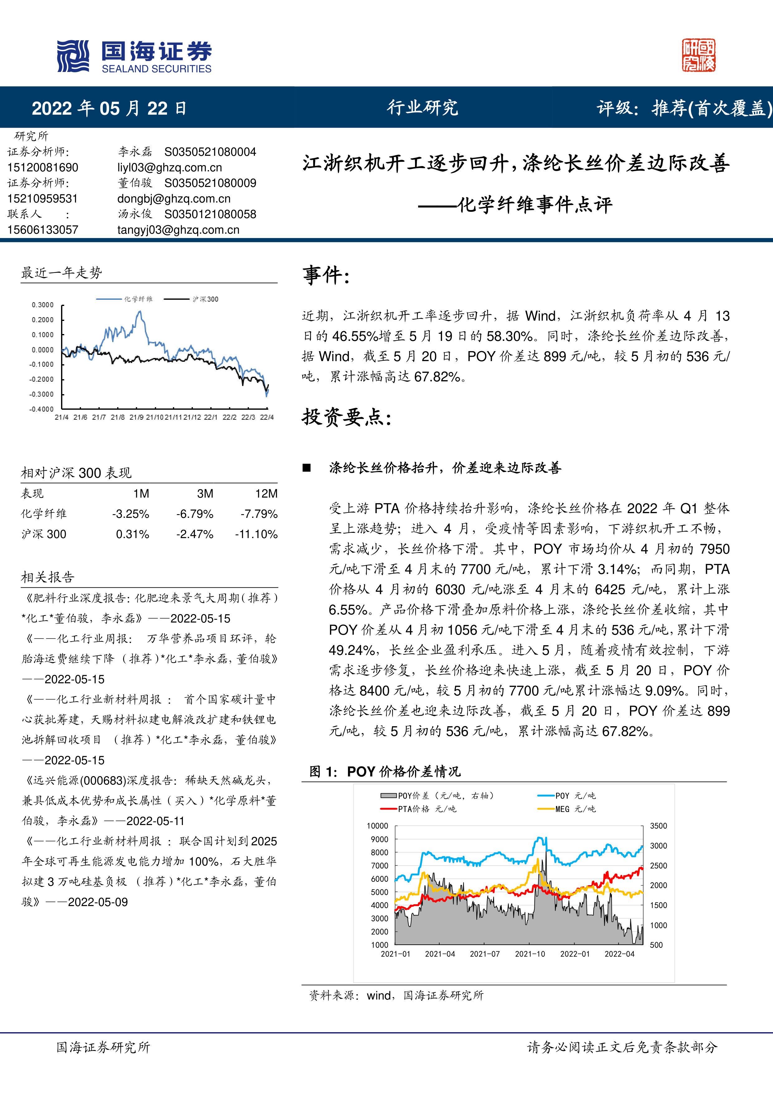 近期,江浙织机开工率逐步回升,据Wind,江浙织机负荷率从4月13日的46.55%增至5月19日的58.30%。同时,涤纶长丝价差边际改善,据Wind,截至5月20日,POY价差达899元/吨,较5月初的536元/吨,累计涨幅高达67.82%。投资要点: