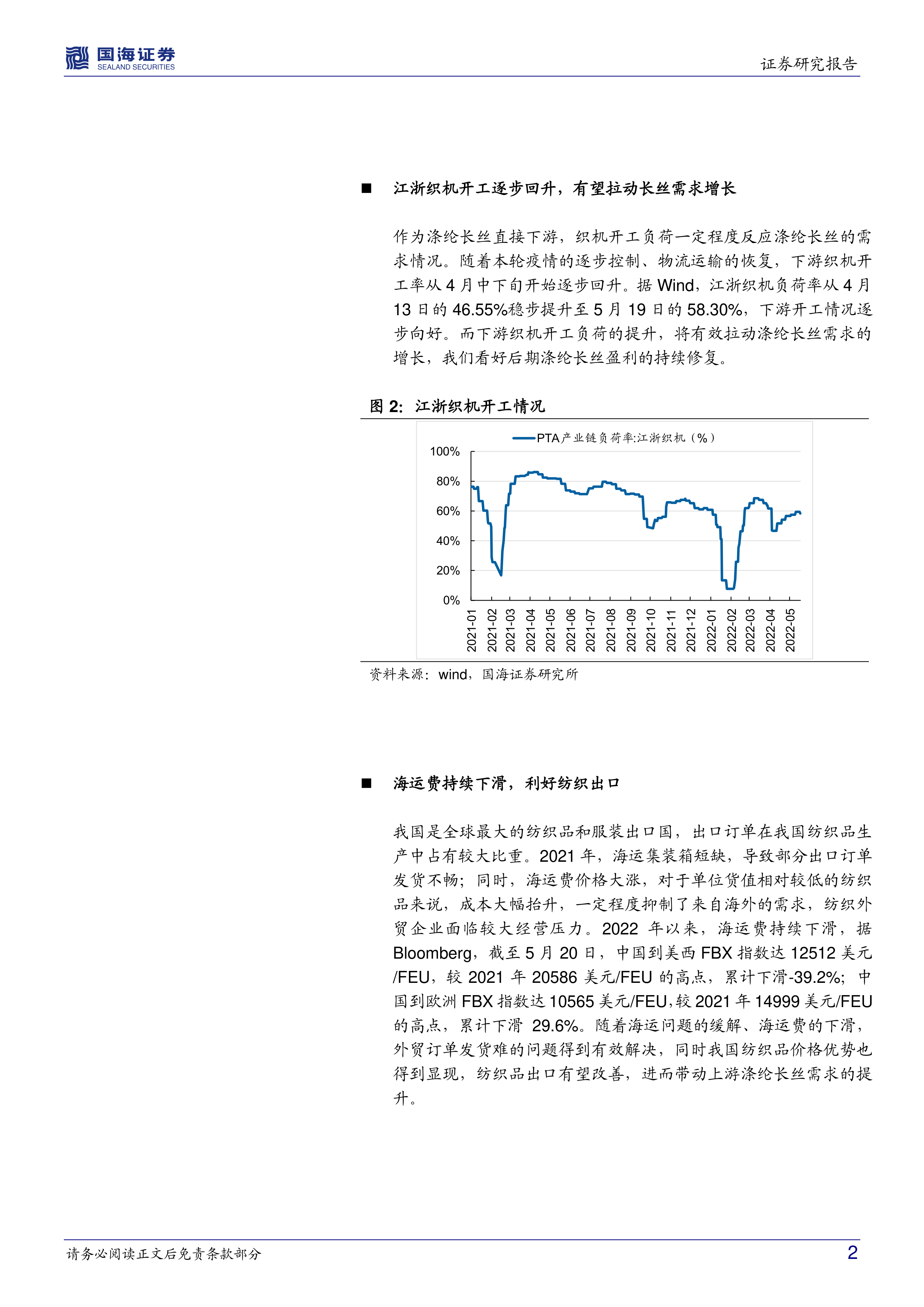 报告分析了涤纶长丝价格、织机开工率和海运费等关键因素,认为这些因素的变化将共同推动行业盈利能力的修复。