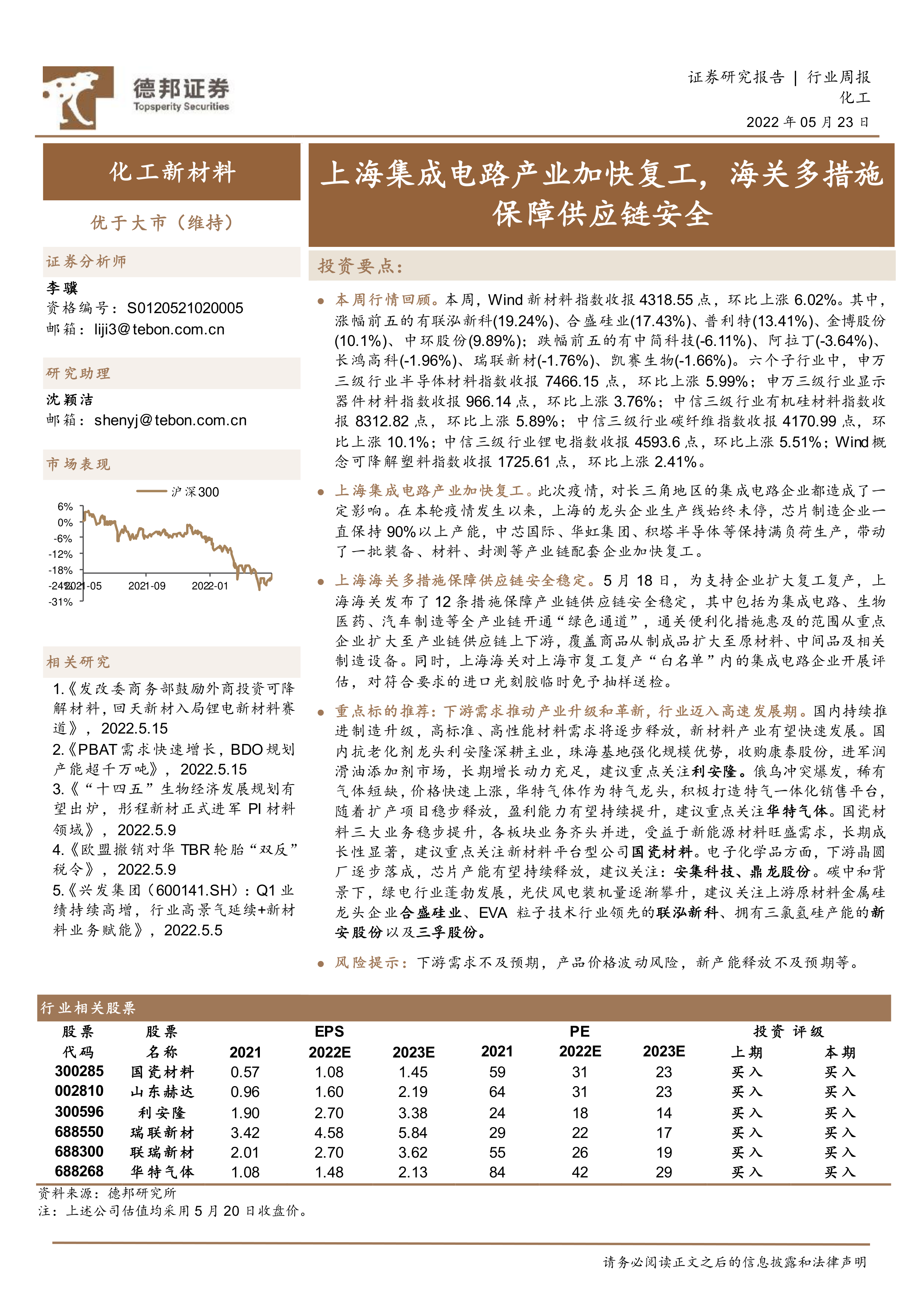 化工新材料行业周报:上海集成电路产业加快复工,海关多措施保障供应链安全