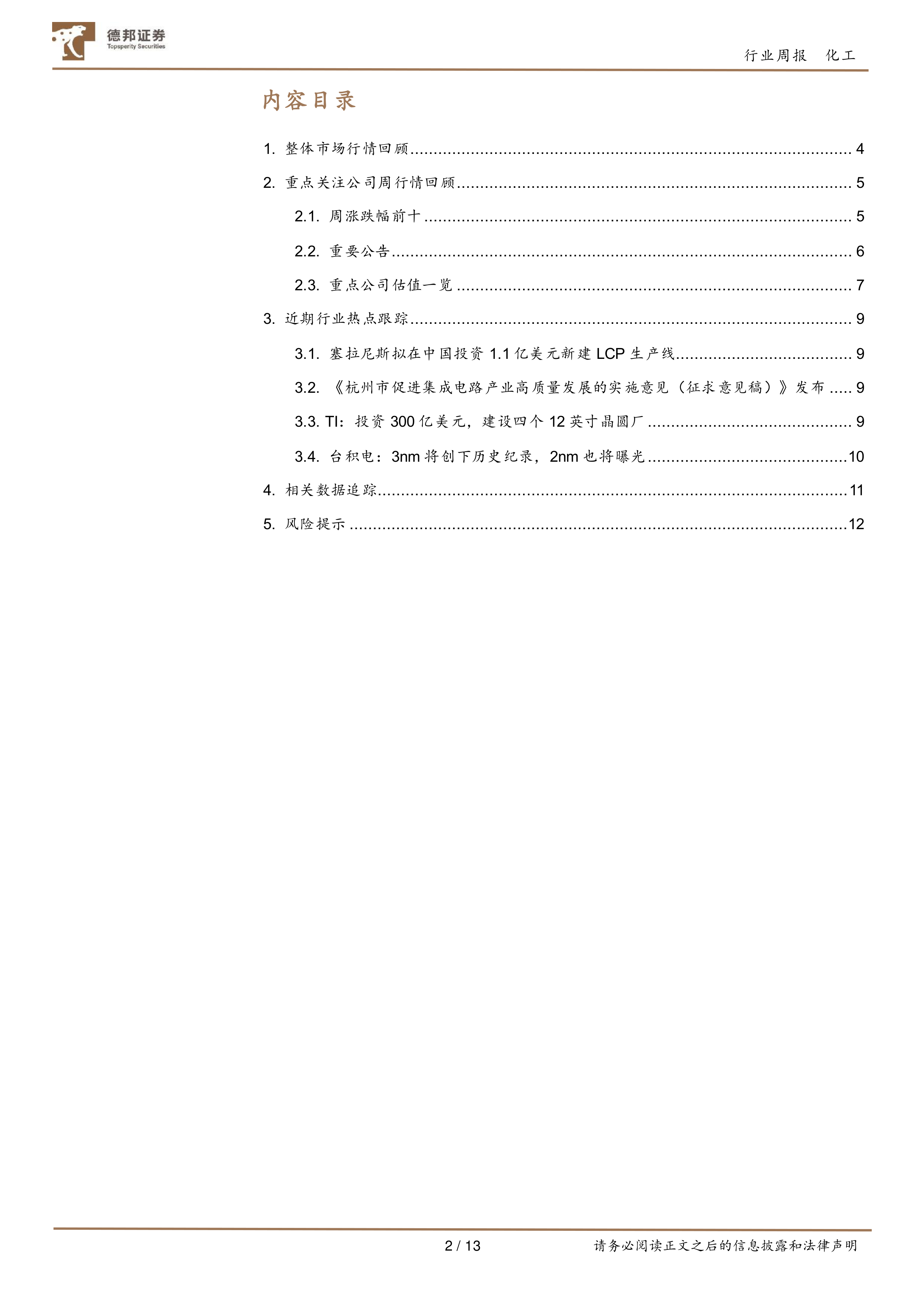 本周化工新材料板块表现活跃,上海集成电路产业复工加速,叠加海关保障供应链安全的措施,为相关新材料行业带来发展机遇。 投资者应关注行业内重点公司的估值及公告,同时密切关注行业热点和相关数据,把握投资机会。 风险提示:下游需求不及预期,产品价格波动风险,新产能释放不及预期等。