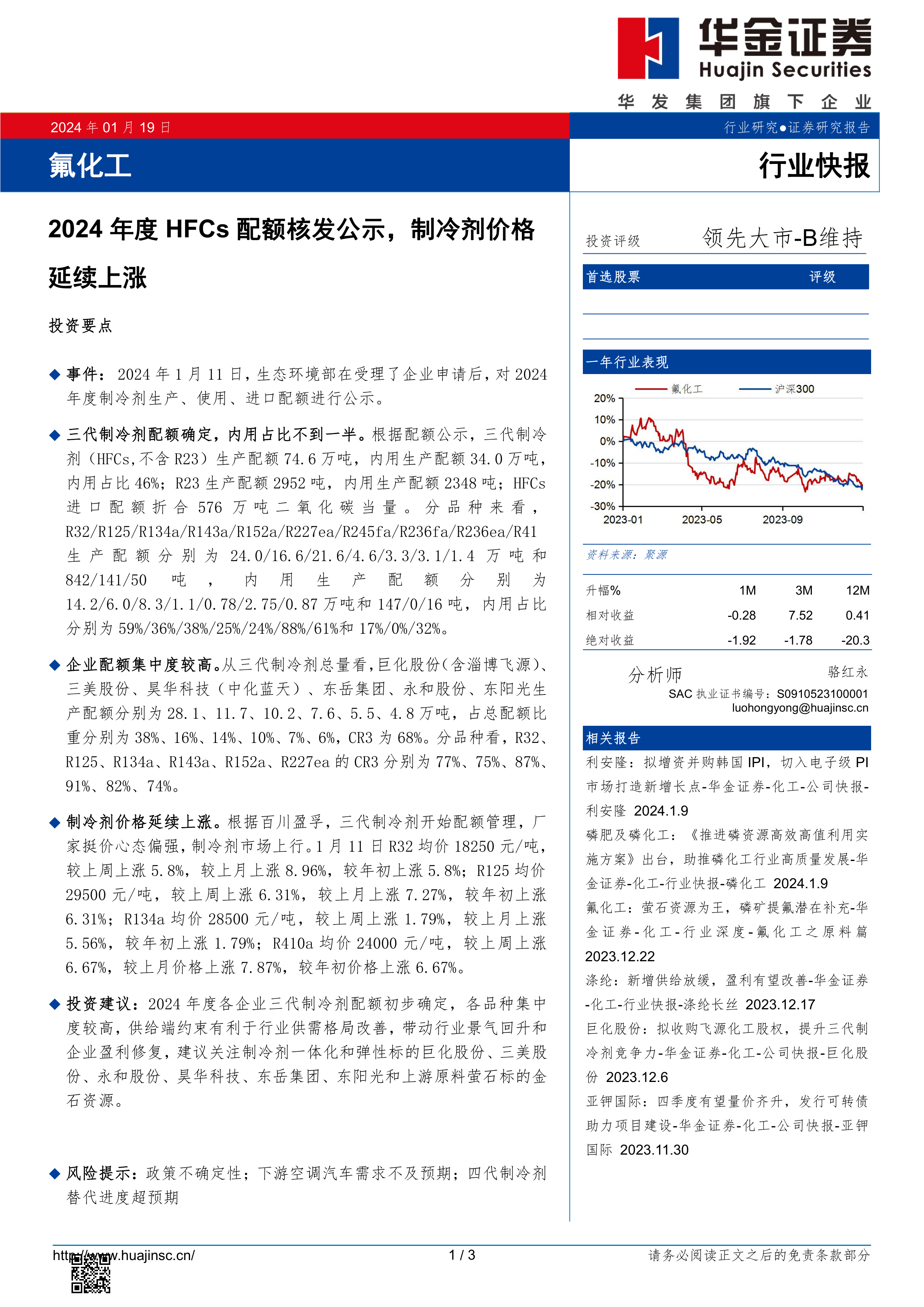氟化工:2024年度HFCs配额核发公示,制冷剂价格延续上涨
