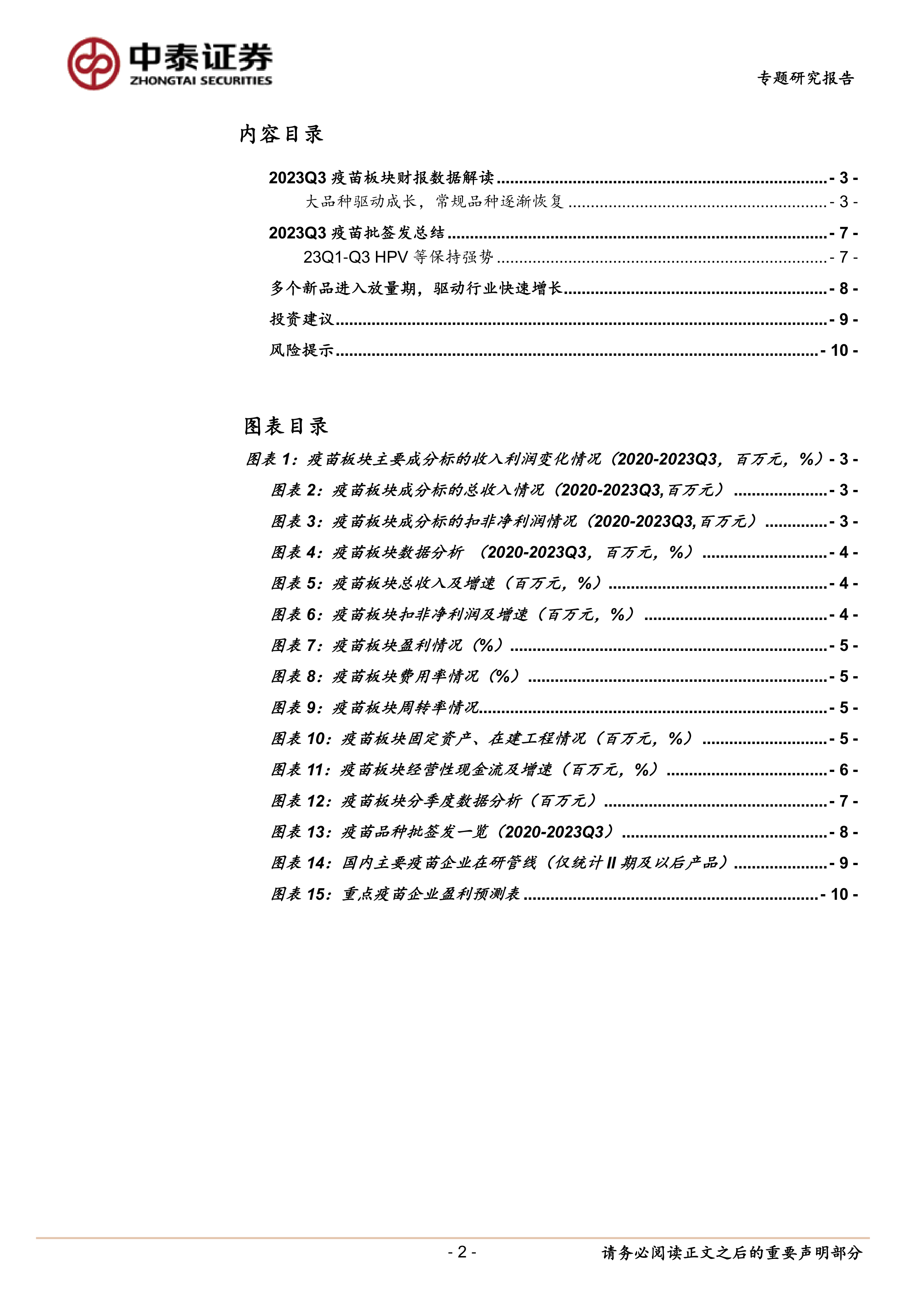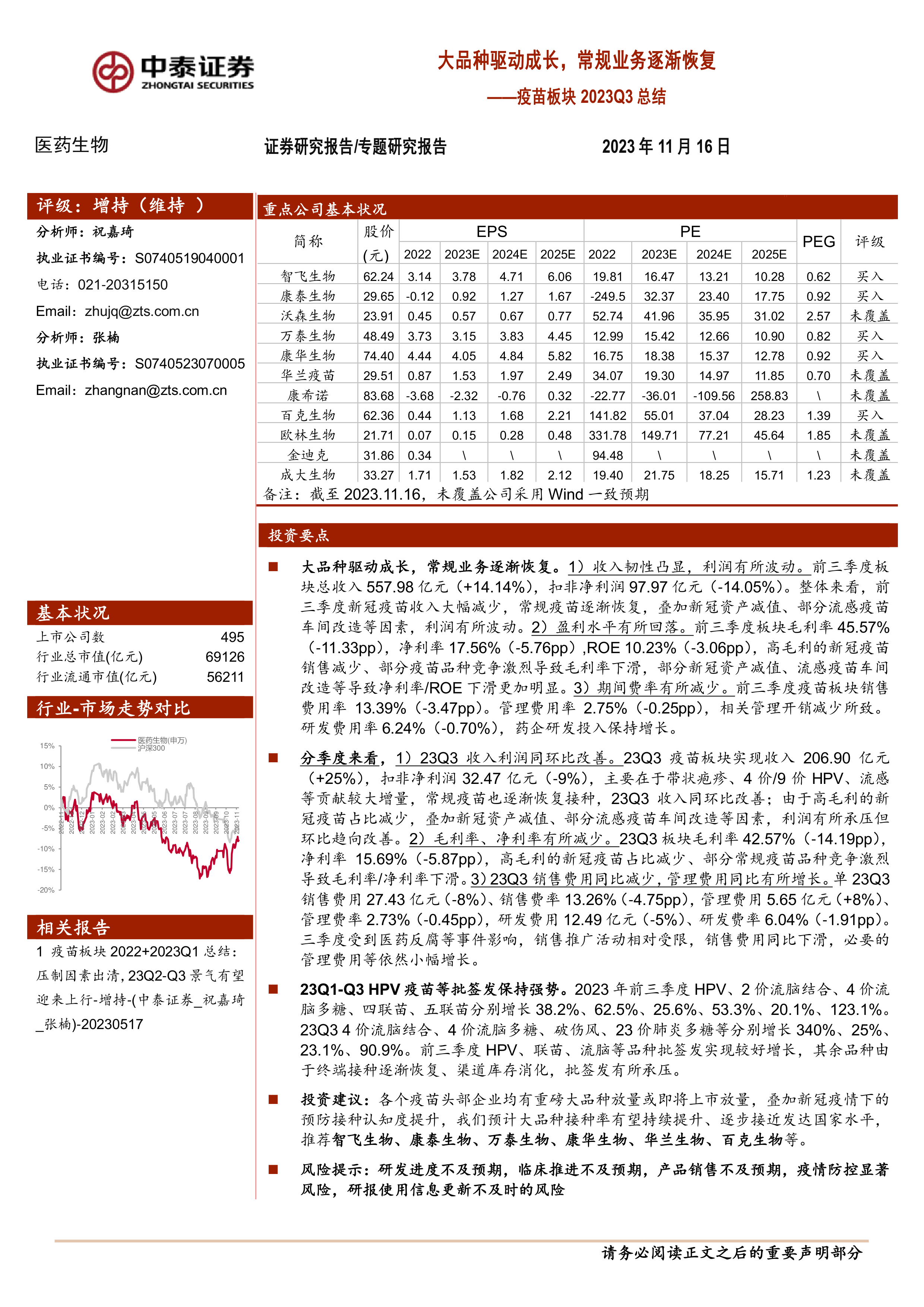 疫苗板块2023Q3总结:大品种驱动成长,常规业务逐渐恢复