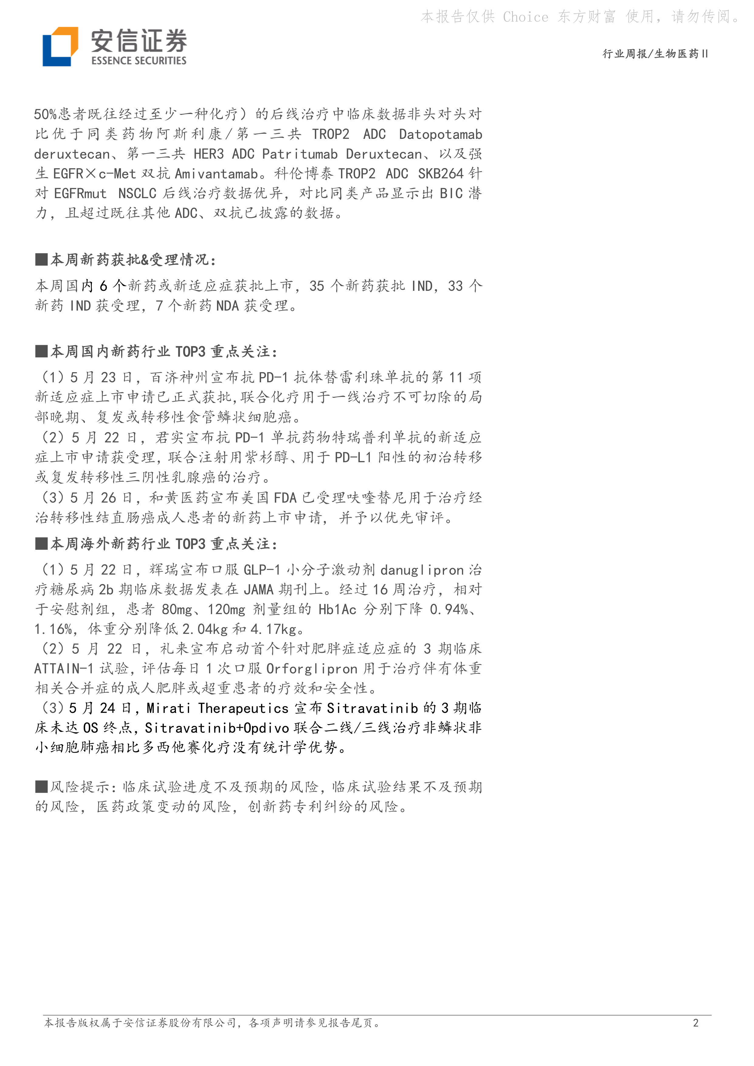 风险提示:临床试验进度不及预期的风险,临床试验结果不及预期的风险,医药政策变动的风险,创新药专利纠纷的风险。