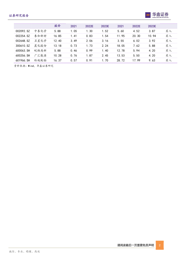 在双碳的背景下,光伏和风电行业迎来快速发展,看好POE,PVB未来在光伏胶膜中的应用,聚醚胺有望成为未来两年风电材料的唯一瓶颈,从产业趋势维度,建议关注卫星石化,皖维高新,晨化股份;新旧能源转换衔接阶段,现阶段旧能源依然是能源供给主力,但行业资本开支不足,从估值维度,建议关注低估值,高成长的广汇能源;新材料国产化一直是国家大力推行的方向,从技术壁垒维度,建议关注芳纶龙头泰和新材;本土汽车品牌崛起,汽车市场繁荣,催生民族轮胎巨头,从困境反转维度,建议关注玲珑轮胎。