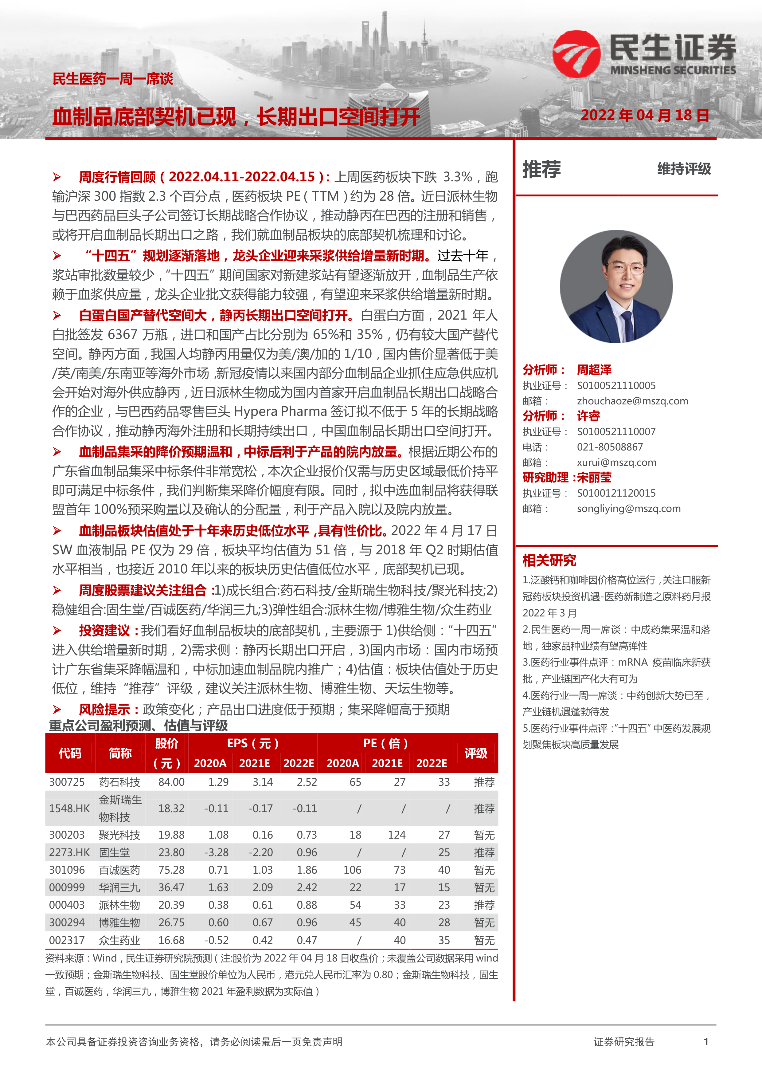 民生医药一周一席谈:血制品底部契机已现,长期出口空间打开