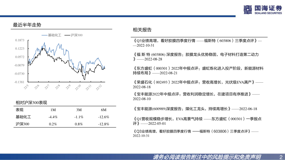 四季度,乙烯-醋酸乙烯共聚物(EVA)价格回调幅度较大,主要系供给端新疆天利高新新增20万吨产能投放,而下游胶膜需求增长平稳,且发泡、电缆等不达预期,前期供需紧张有所缓解。目前,EVA价格已跌至近两年低位,向后看,供给端国内新增产能集中于2025年释放,而需求端,受益于硅料降价,下游组件排产有望超预期,发泡、电缆等在疫情常态化后需求亦有望改善,看好EVA价格探底回升,首次覆盖,给予EVA行业推荐评级。我们推荐光伏级EVA产能及规划最大且拥有上游醋酸乙烯一体化产业链的东方盛虹、荣盛石化,建议关注联泓新科、宝丰能源。