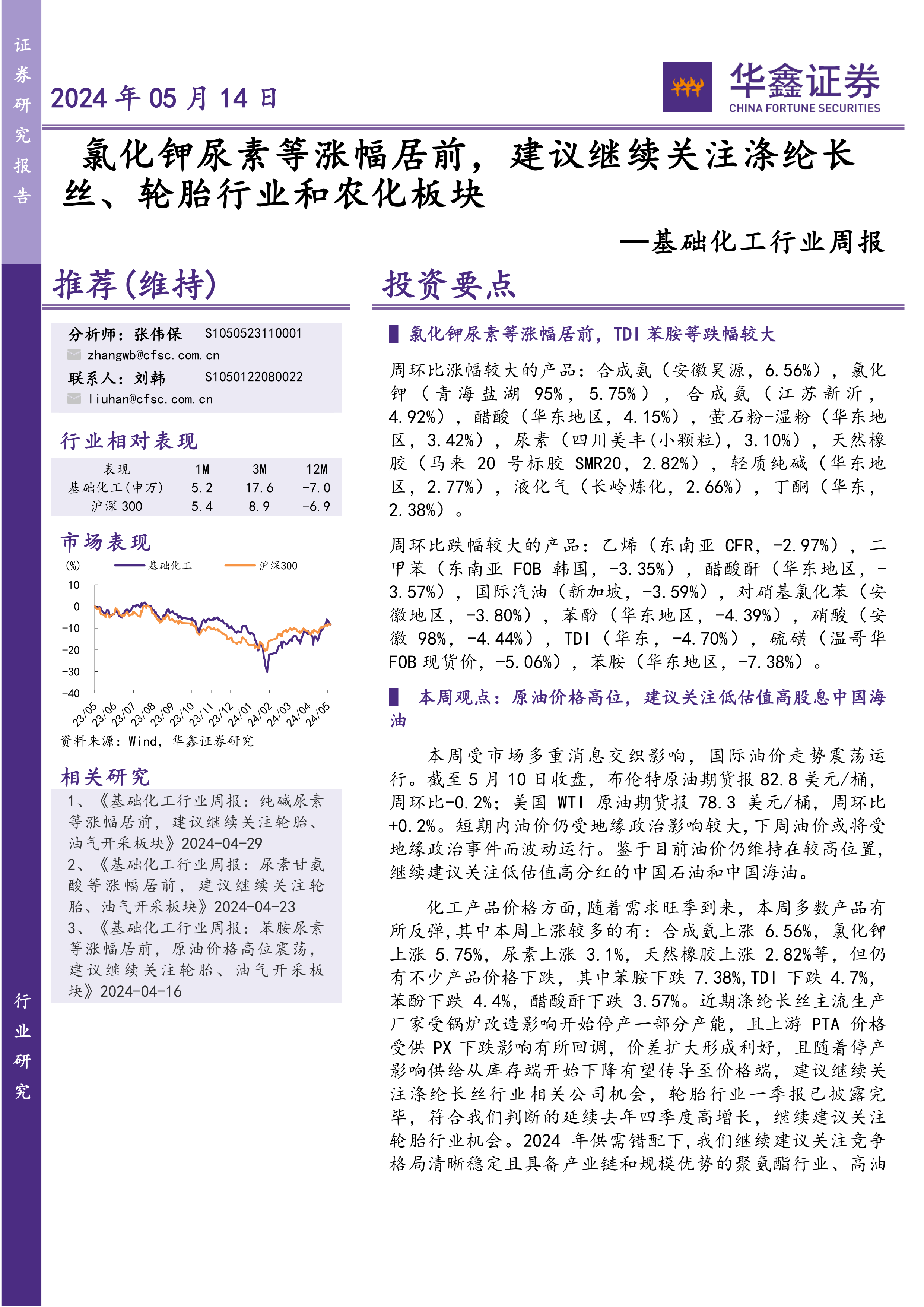 基础化工行业周报:氯化钾尿素等涨幅居前,建议继续关注涤纶长丝、轮胎行业和农化板块