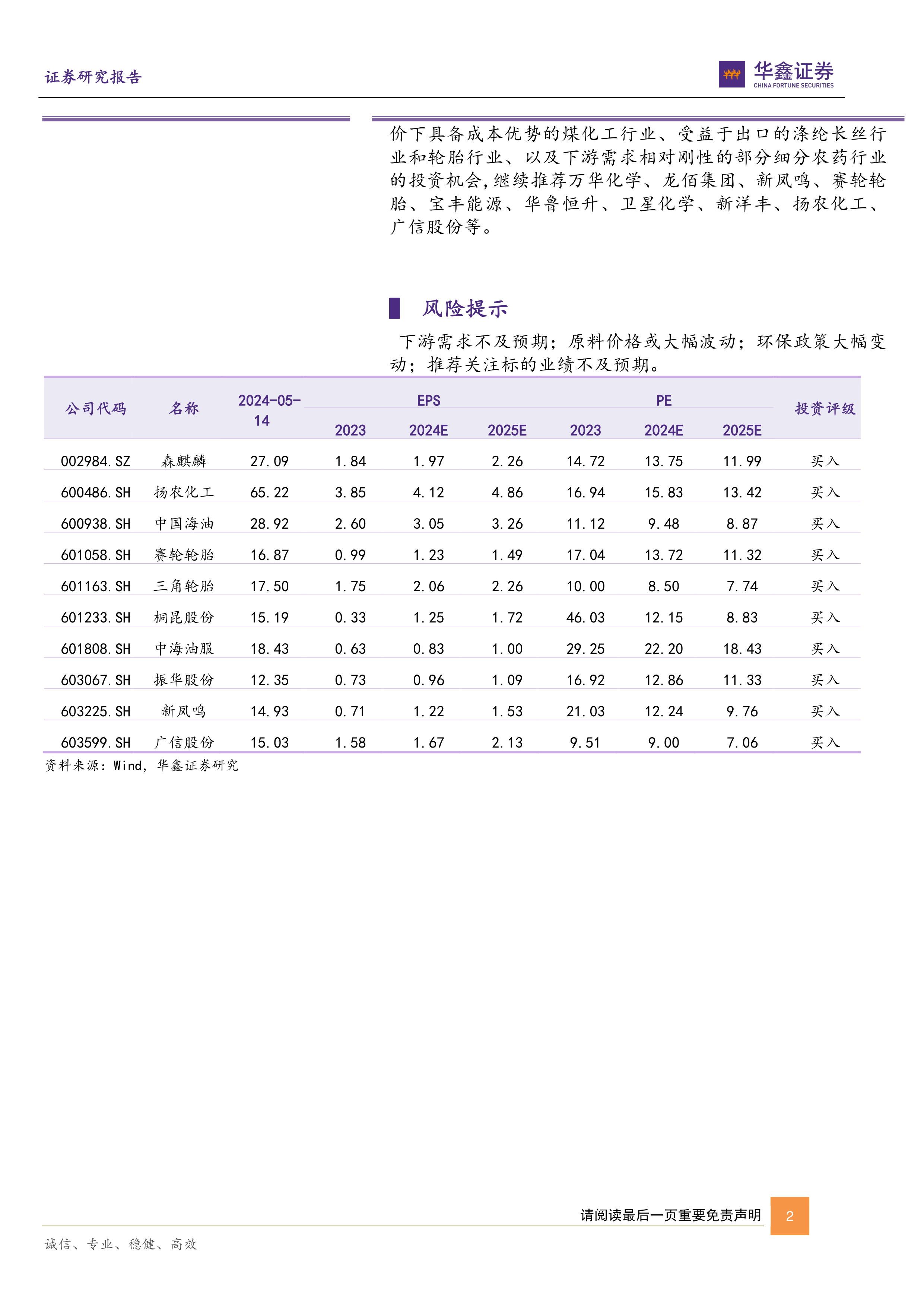 化工产品价格方面,随着需求旺季到来,本周多数产品有所反弹,其中本周上涨较多的有:合成氨上涨6.56%,氯化钾上涨5.75%,尿素上涨3.1%,天然橡胶上涨2.82%等,但仍有不少产品价格下跌,其中苯胺下跌7.38%,TDI下跌4.7%,苯酚下跌4.4%,醋酸酐下跌3.57%。近期涤纶长丝主流生产厂家受锅炉改造影响开始停产一部分产能,且上游PTA价格受供PX下跌影响有所回调,价差扩大形成利好,且随着停产影响供给从库存端开始下降有望传导至价格端,建议继续关注涤纶长丝行业相关公司机会,轮胎行业一季报已披露完毕,符合我们判断的延续去年四季度高增长,继续建议关注轮胎行业机会。2024年供需错配下,我们继续建议关注竞争格局清晰稳定且具备产业链和规模优势的聚氨酯行业、高油价下具备成本优势的煤化工行业、受益于出口的涤纶长丝行业和轮胎行业、以及下游需求相对刚性的部分细分农药行业的投资机会,继续推荐万华化学、龙佰集团、新凤鸣、赛轮轮胎、宝丰能源、华鲁恒升、卫星化学、新洋丰、扬农化工、广信股份等。