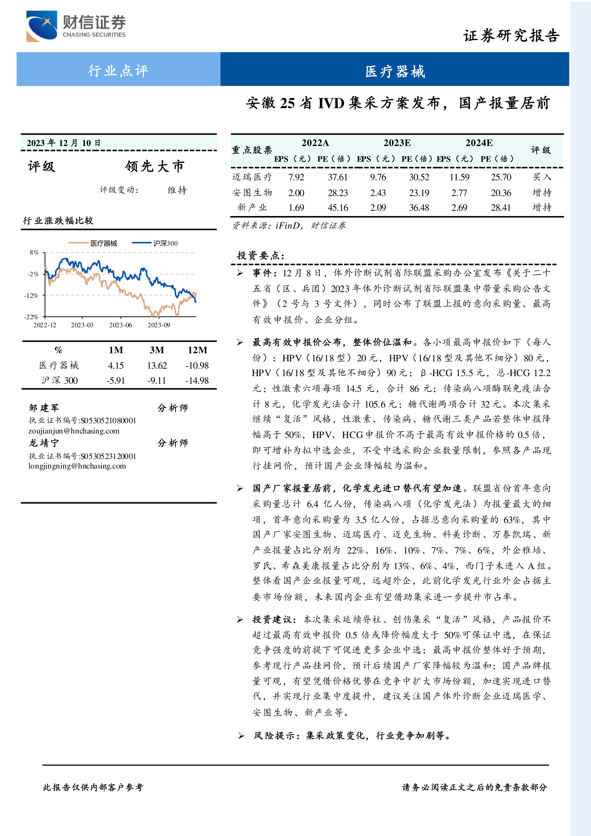 报告建议关注国产体外诊断企业,并提示了集采政策变化和行业竞争加剧等风险因素。
