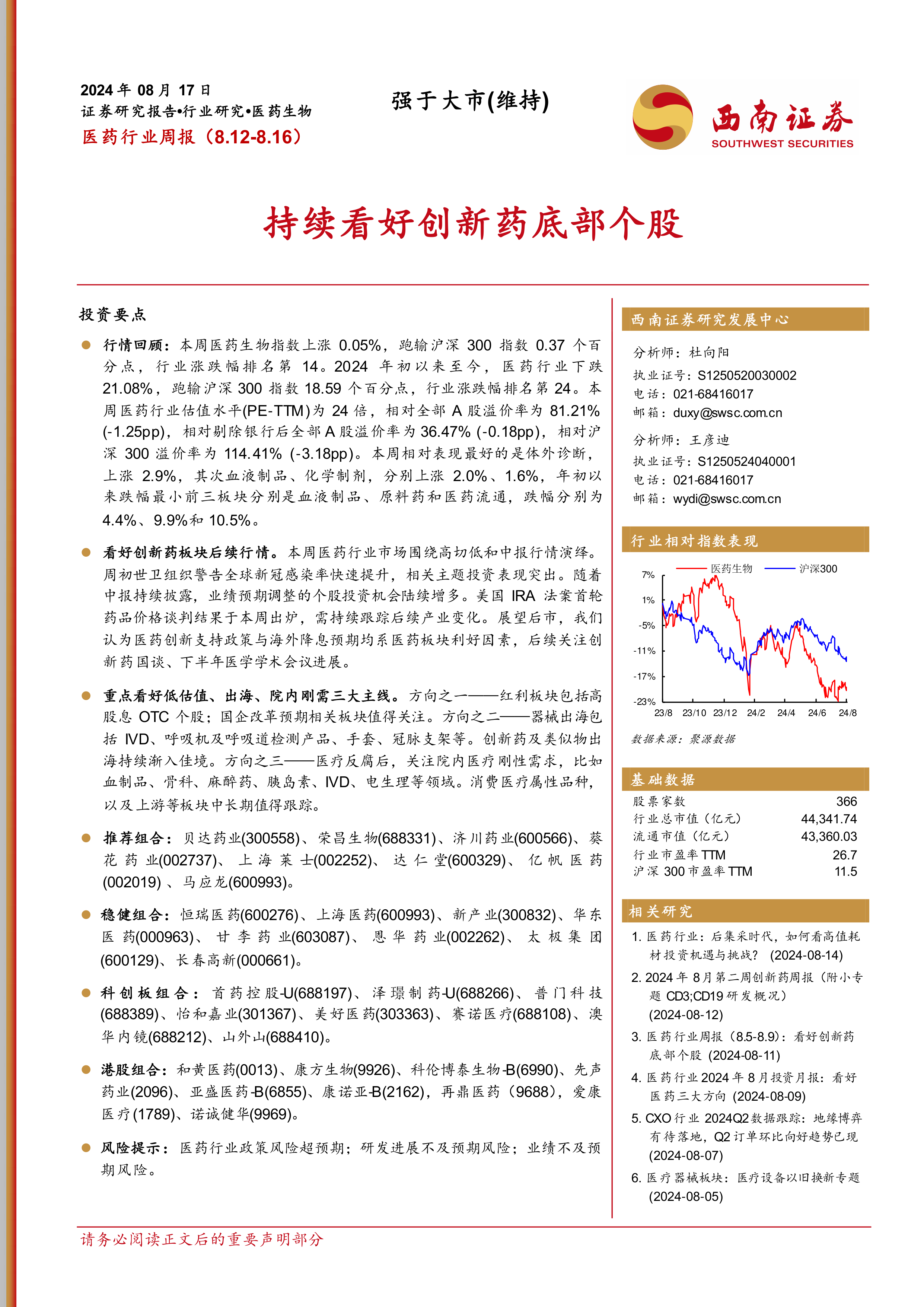 风险提示:医药行业政策风险超预期;研发进展不及预期风险;业绩不及预期风险。