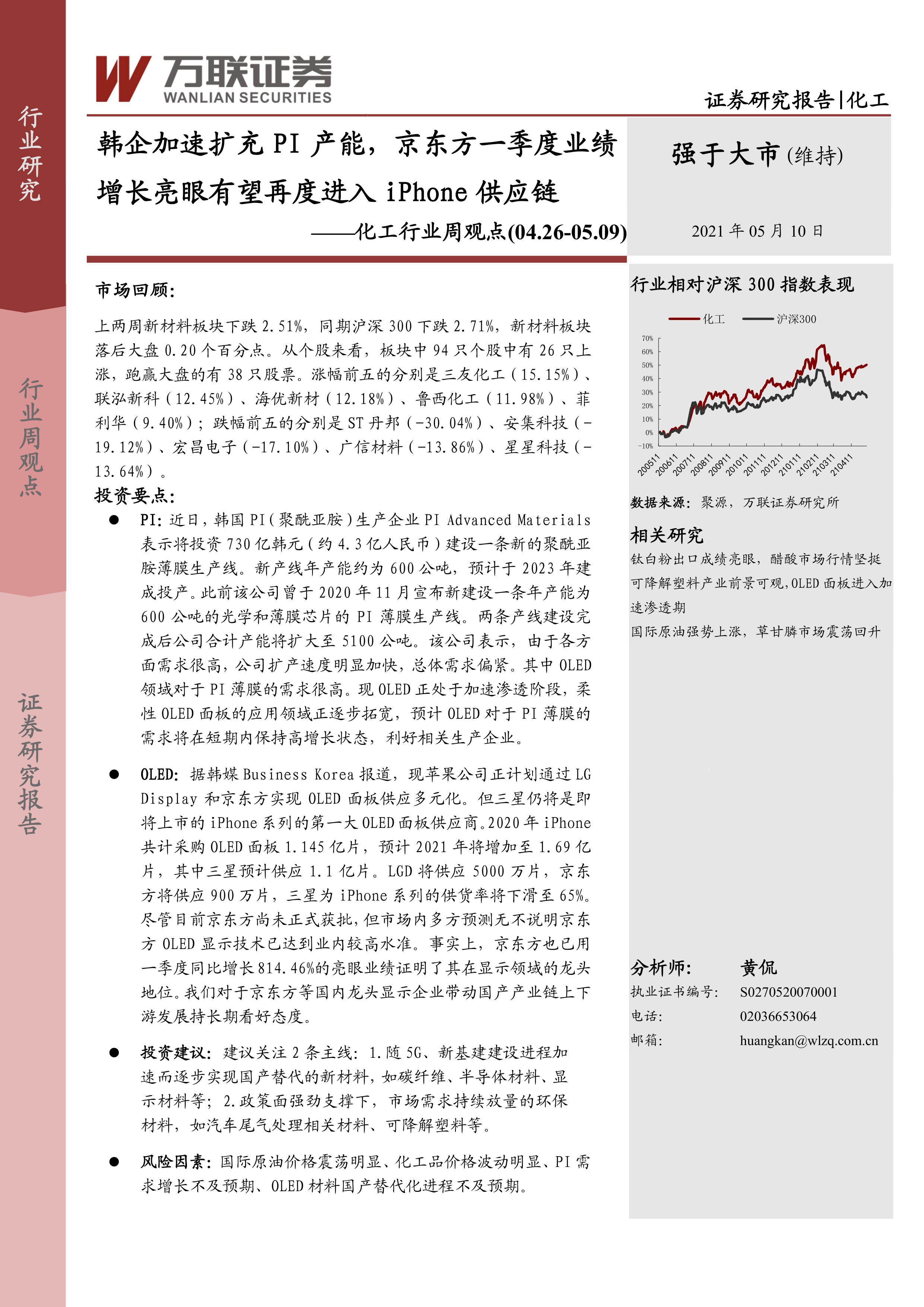 化工行业周观点:韩企加速扩充PI产能,京东方一季度业绩增长亮眼有望再度进入iPhone供应链