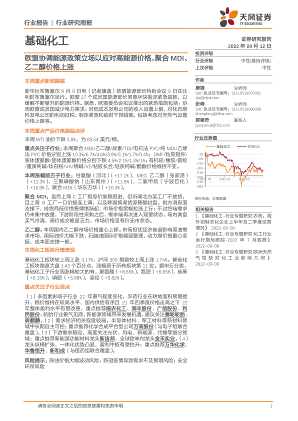 基础化工行业研究周报:欧盟协调能源政策立场以应对高能源价格,聚合MDI、乙二醇价格上涨
