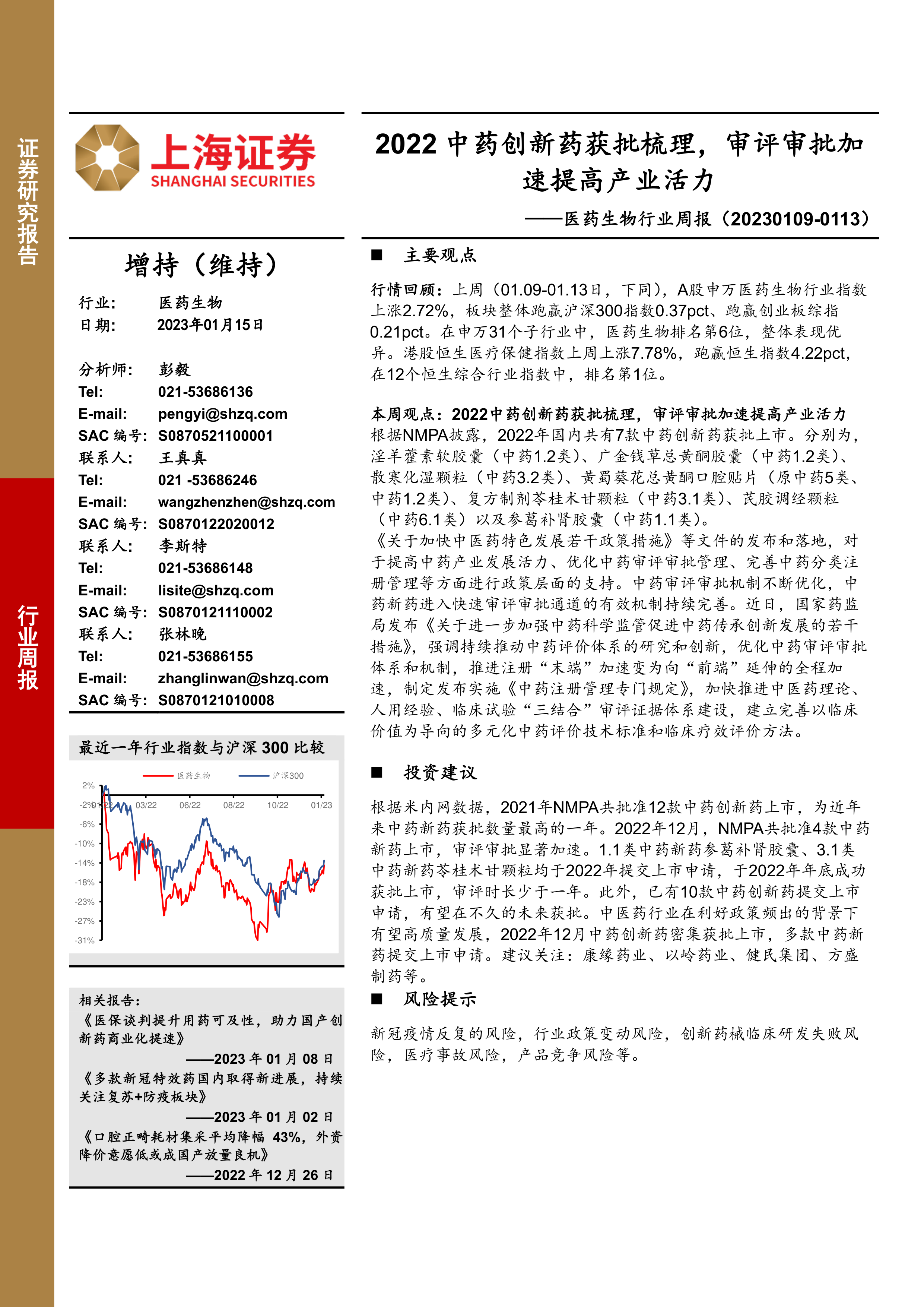 本周观点:2022中药创新药获批梳理,审评审批加速提高产业活力根据NMPA披露,2022年国内共有7款中药创新药获批上市。分别为,淫羊藿素软胶囊(中药1.2类)、广金钱草总黄酮胶囊(中药1.2类)、散寒化湿颗粒(中药3.2类)、黄蜀葵花总黄酮口腔贴片(原中药5类、中药1.2类)、复方制剂苓桂术甘颗粒(中药3.1类)、芪胶调经颗粒(中药6.1类)以及参葛补肾胶囊(中药1.1类)。《 关于加快中医药特色发展若干政策措施》等文件的发布和落地,对于提高中药产业发展活力、优化中药审评审批管理、完善中药分类注册管理等方面进行政策层面的支持。中药审评审批机制不断优化,中药新药进入快速审评审批通道的有效机制持续完善。近日,国家药监局发布《关于进一步加强中药科学监管促进中药传承创新发展的若干措施》,强调持续推动中药评价体系的研究和创新,优化中药审评审批体系和机制,推进注册“末端”加速变为向“前端”延伸的全程加速,制定发布实施《中药注册管理专门规定》,加快推进中医药理论、人用经验、临床试验“三结合”审评证据体系建设,建立完善以临床价值为导向的多元化中药评价技术标准和临床疗效评价方法。