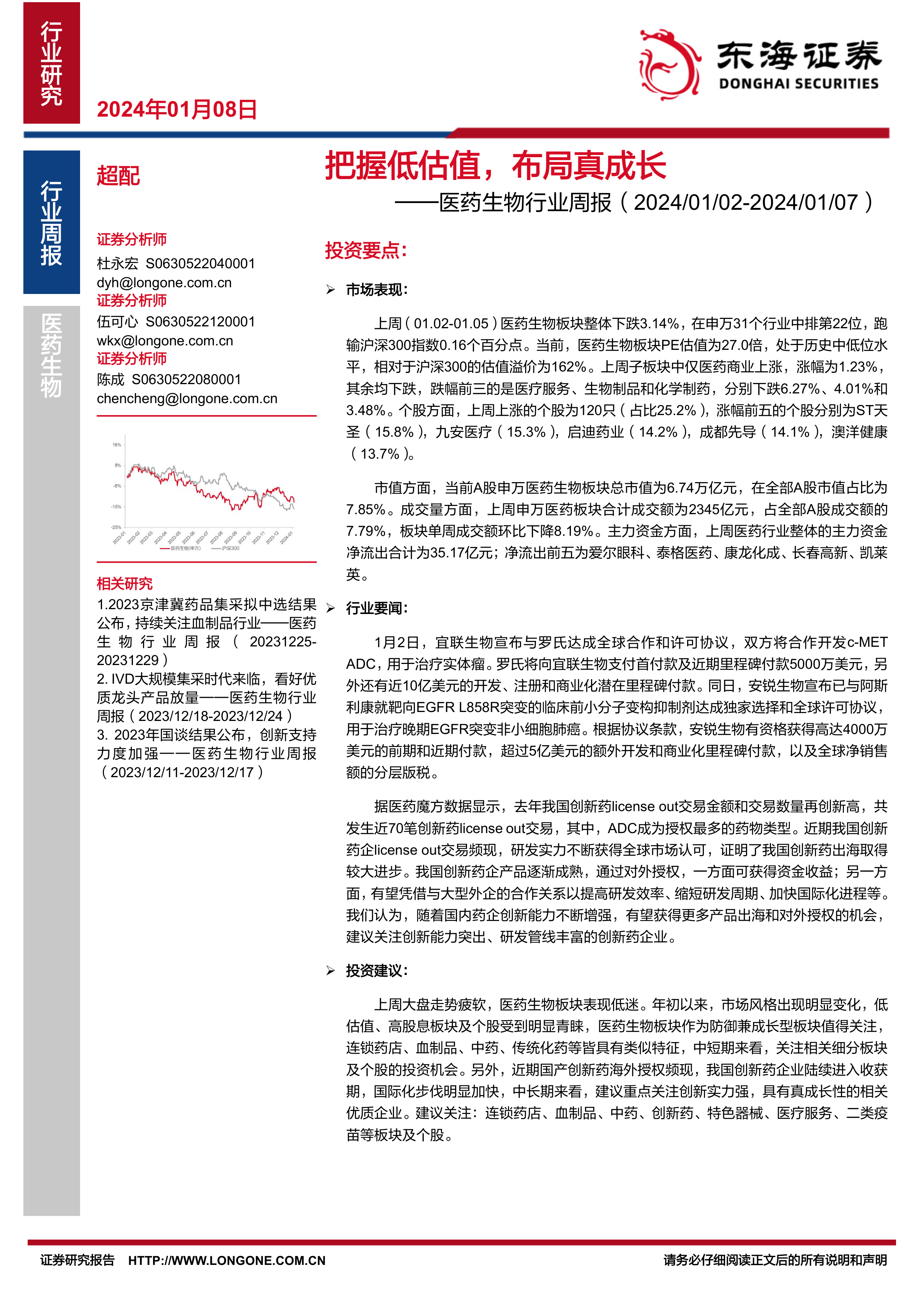 上周大盘走势疲软,医药生物板块表现低迷。年初以来,市场风格出现明显变化,低估值、高股息板块及个股受到明显青睐,医药生物板块作为防御兼成长型板块值得关注,连锁药店、血制品、中药、传统化药等皆具有类似特征,中短期来看,关注相关细分板块及个股的投资机会。另外,近期国产创新药海外授权频现,我国创新药企业陆续进入收获期,国际化步伐明显加快,中长期来看,建议重点关注创新实力强,具有真成长性的相关优质企业。建议关注:连锁药店、血制品、中药、创新药、特色器械、医疗服务、二类疫苗等板块及个股。