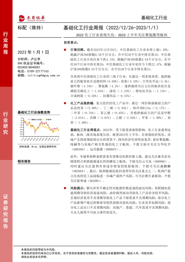 基础化工行业周报:2022化工行业表现欠佳,2023上半年关注聚氨酯等板块