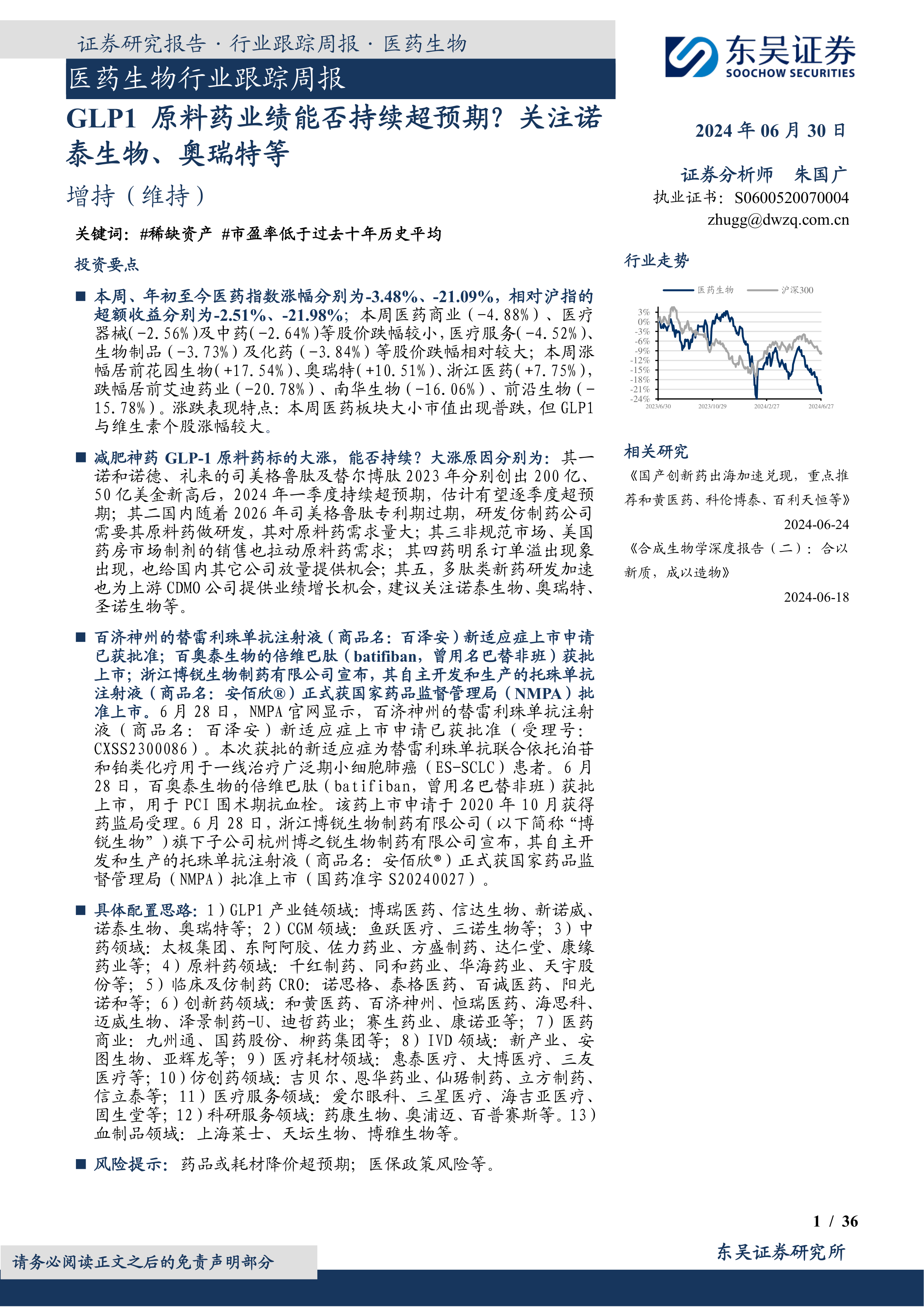 医药生物行业跟踪周报:GLP1原料药业绩能否持续超预期?关注诺泰生物、奥瑞特等