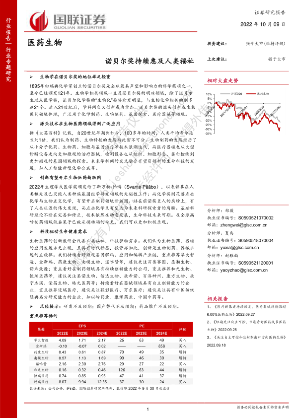 生物医药的创新最终会改善人类福祉,科技驱动需求。我们认为生物医药、器械的应用发展永无止境, 且具有时代标签,投资亦如此,创新是生物制药、器械永远的主旋律。我们持续看好微观基因解码、应用和编辑产业链,重点推荐华大智造、金斯瑞、药康生物、南模生物、诺唯赞等,建议关注百奥赛图、圣湘生物、诺禾致源;重点看好在制药领域具有持续创新能力的公司,重点推荐和元生物、恒瑞医药等,建议关注圣诺生物、信达生物、康希诺、百济神州、康方生物、康宁杰瑞、荣昌生物、皓元医药等;持续看好在器械领域具有自主创新能力的企业,重点推荐迈瑞医疗,建议关注联影医疗、万东医疗;建议关注具有中国传统经典名方研发能力的企业,如以岭药业、康缘药业、中国中药等。