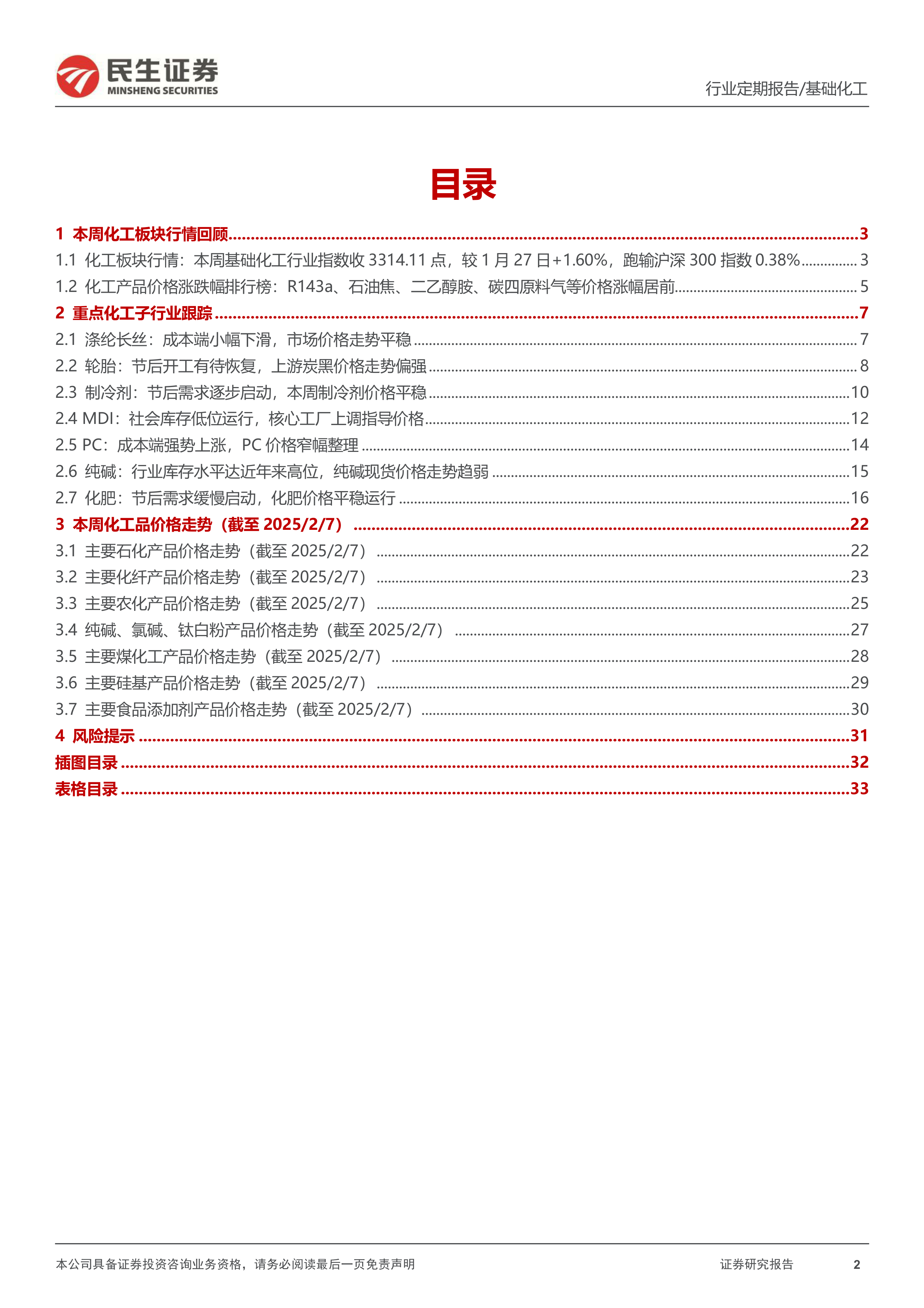 本周化工行业市场表现分化,部分子行业表现突出。 涤纶长丝市场价格平稳,轮胎行业开工有待恢复,制冷剂价格平稳,MDI市场趋势性走强,PC价格窄幅整理,纯碱价格走势趋弱,化肥市场价格平稳。 建议关注MDI、制冷剂、磷化工等细分领域,以及大股东拥有优质体外资产的标的。 风险提示包括下游需求不及预期、原油及天然气价格大幅波动、环保和生产安全等。