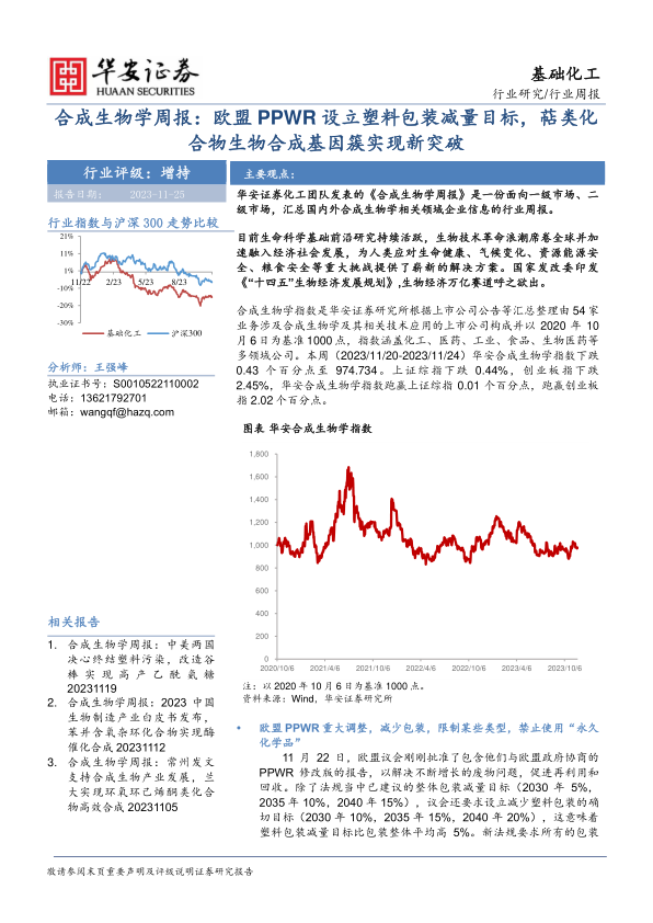 本周(2023/11/20-2023/11/24)合成生物学领域个股整体表现较差,华安合成生物学指数下跌0.43%,跑赢上证综指和创业板指。贝瑞基因、鲁抗医药等公司涨幅居前,莲花健康、康龙化成等公司跌幅较大。