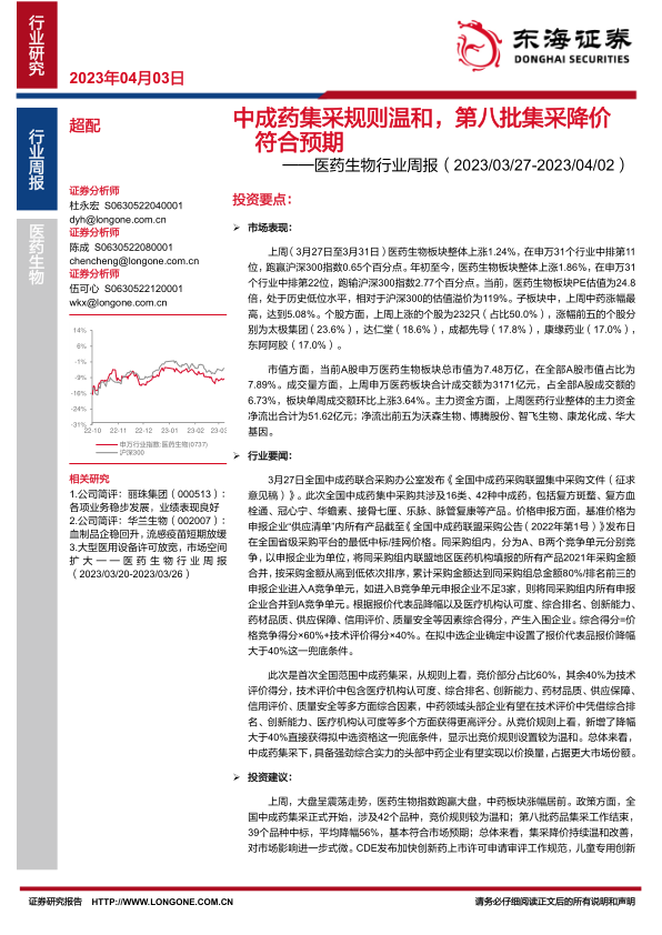 本报告分析了2023年3月27日至2023年4月2日期间医药生物行业的市场表现、重要政策和行业动态,并给出了投资建议和风险提示。 报告指出,医药生物板块上周表现良好,但年初至今表现落后。全国中成药集采和第八批药品集采的推进,以及CDE加快创新药上市的政策,都对行业产生重要影响。 建议投资者关注创新药、品牌中药等细分领域,并注意防范政策、业绩和事件风险。