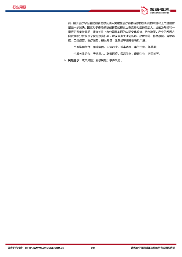 个股推荐组合:丽珠集团、贝达药业、益丰药房、华兰生物、凯莱英;