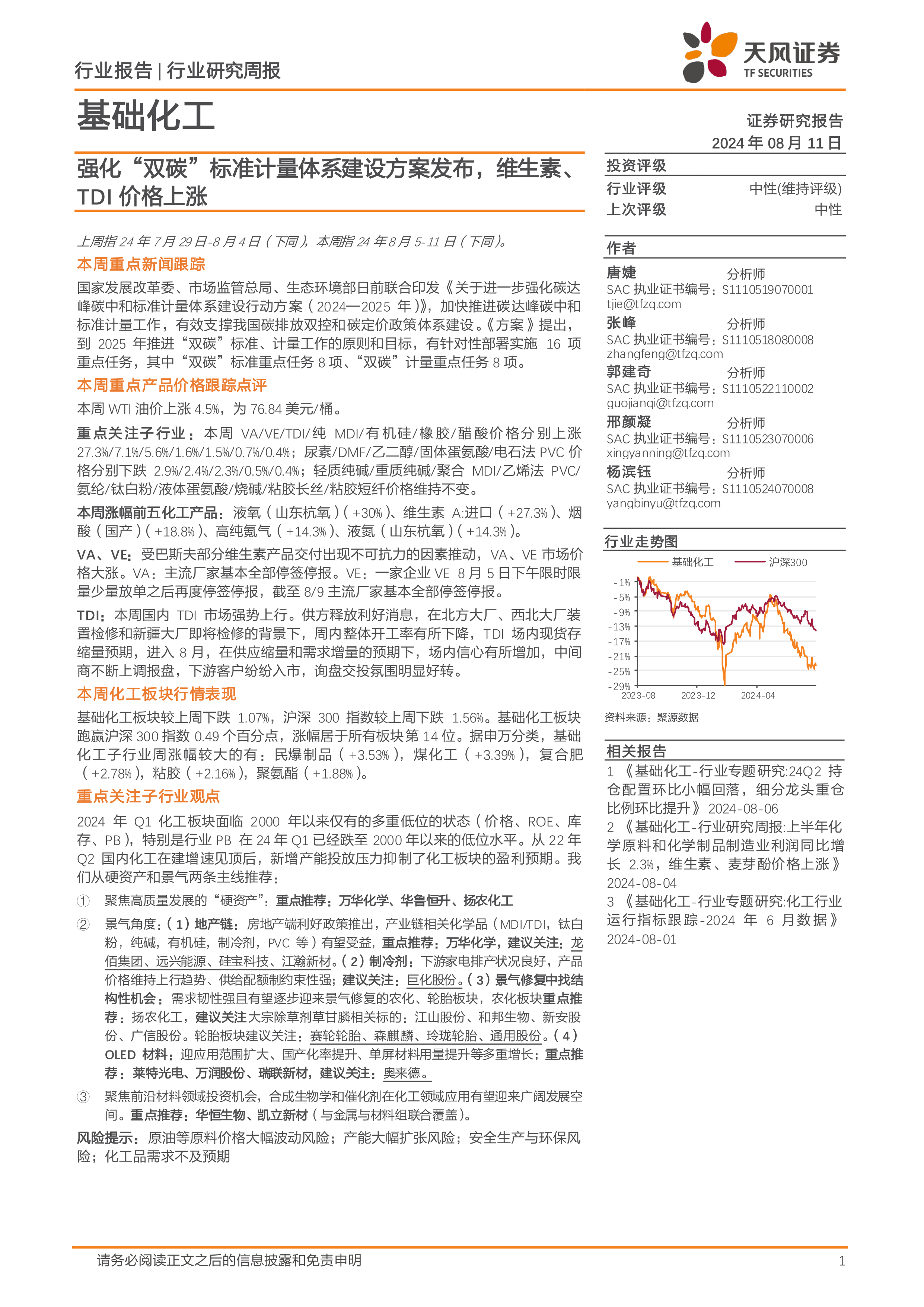 基础化工行业研究周报:强化“双碳”标准计量体系建设方案发布,维生素、TDI价格上涨