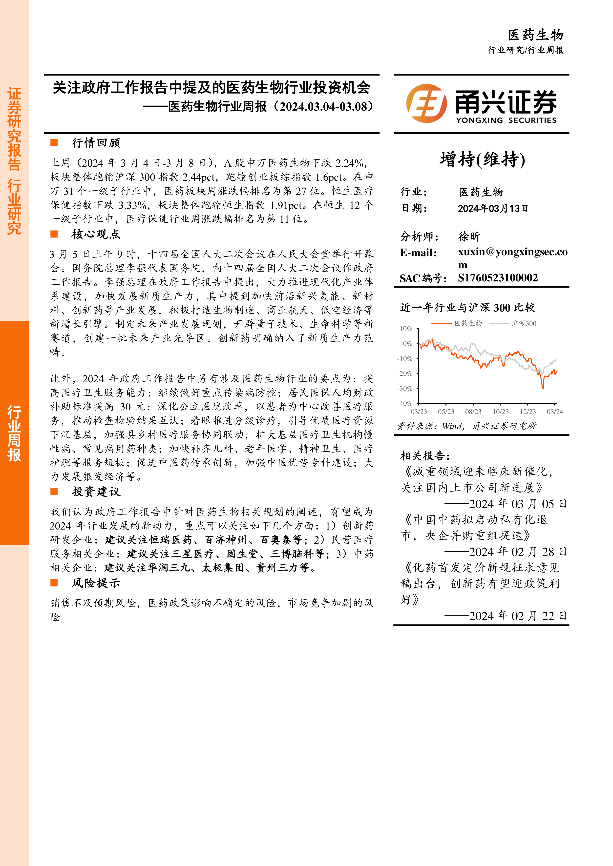 医药生物行业周报:关注政府工作报告中提及的医药生物行业投资机会