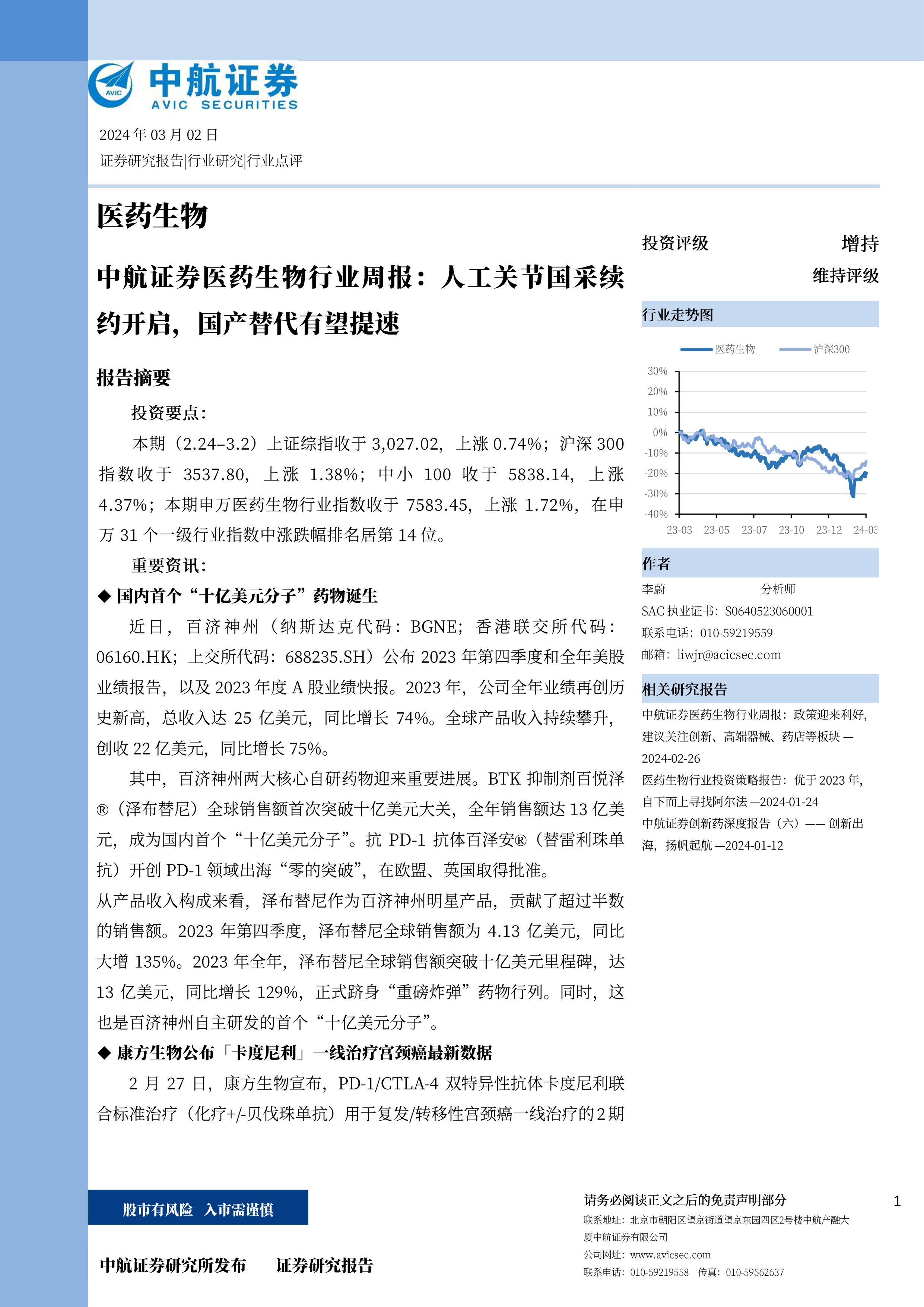 本期(2.24-3.2)上证综指收于3,027.02,上涨0.74%;沪深300指数收于3537.80,上涨1.38%;中小100收于5838.14,上涨4.37%;本期申万医药生物行业指数收于7583.45,上涨1.72%,在申万31个一级行业指数中涨跌幅排名居第14位。