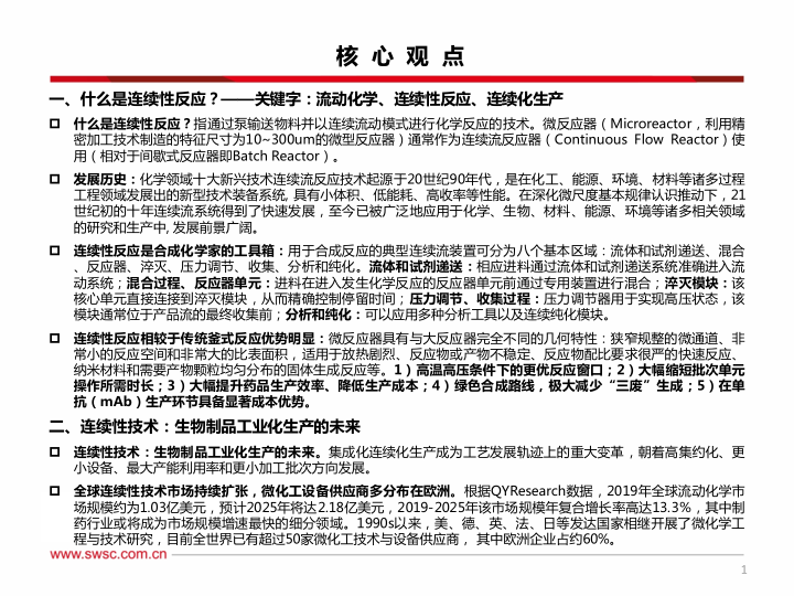 使用连续化生产工艺的药品全球监管趋于完善。国际人用药品注册技术协调会(ICH)2018年起逐步推进指南制定工作,2021年7月27日签署Q13指南第2阶段文件并由ICH监管成员发布以征求公众意见,对于药品连续化生产发展具有里程碑意义;此外,FDA、EMA、MHRA、PMDA等均出台相关监管政策以鼓励药品生产方式的持续创新。2021年,《“十四五”医药工业发展规划》指出围绕原料药生产中应用面广的绿色生产技术,如微反应连续合成、生物转化、手性合成、贵金属催化剂替代、电化学反应、合成生物技术、低VOCs排放工艺设备等开展绿色生产技术应用示范项目,为连续性反应的大规模推广打开长期空间。