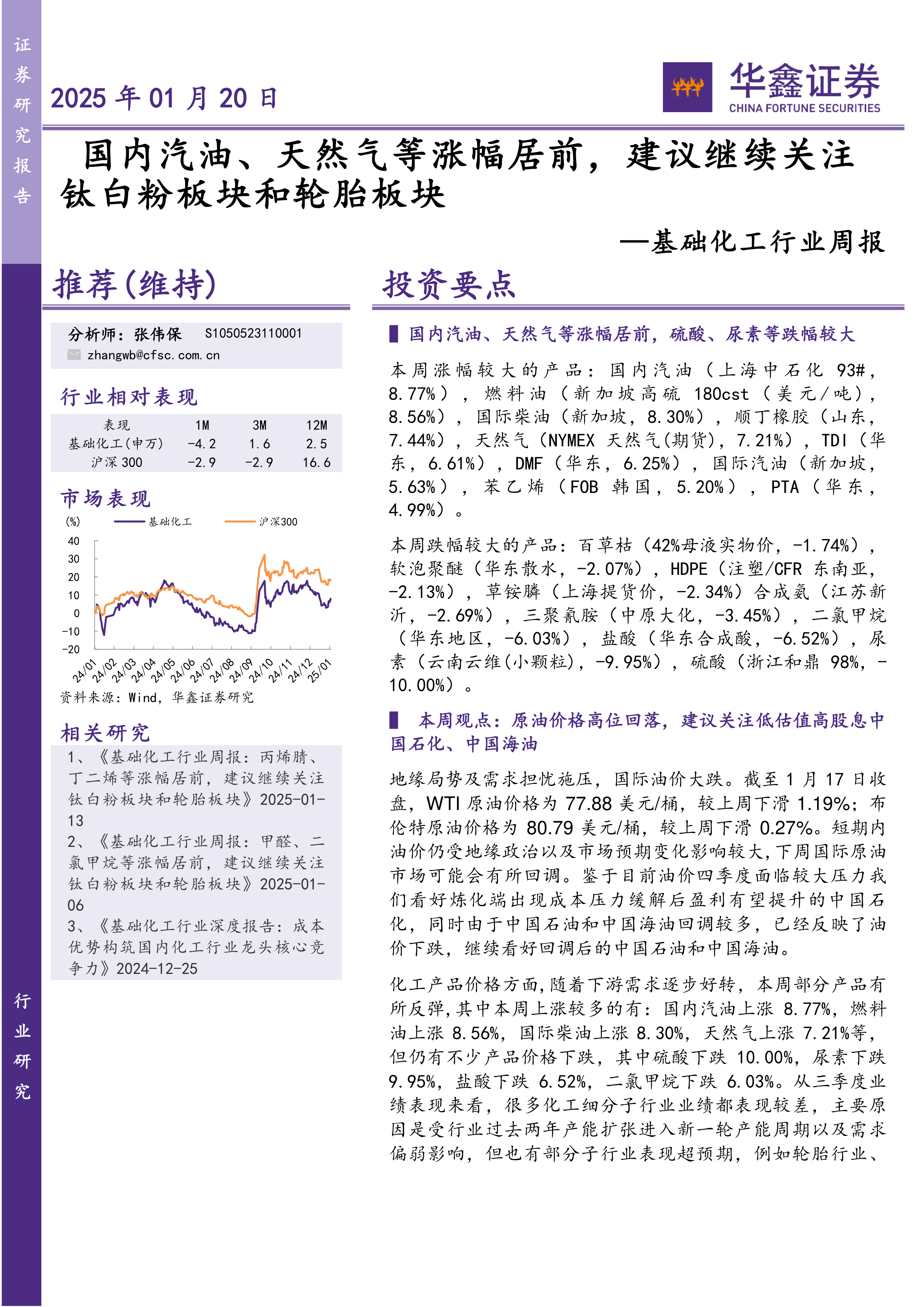 基础化工行业周报:国内汽油、天然气等涨幅居前,建议继续关注钛白粉板块和轮胎板块