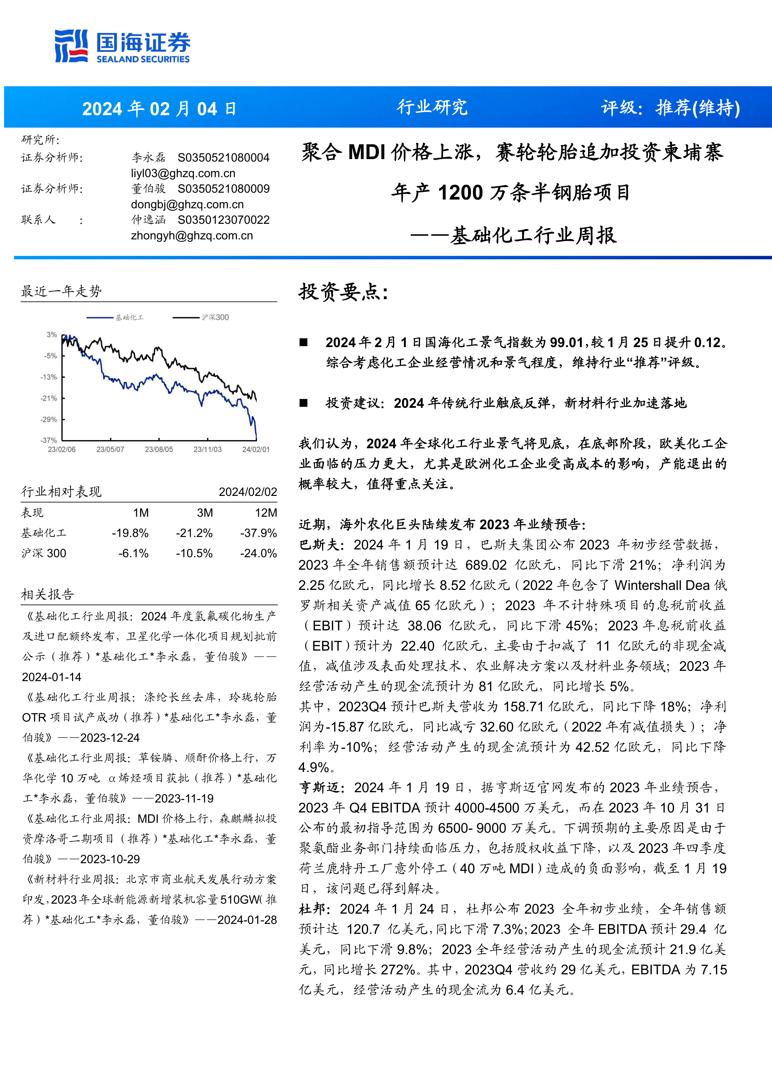 2024年2月1日国海化工景气指数为99.01,较1月25日提升0.12。综合考虑化工企业经营情况和景气程度,维持行业“推荐”评级。