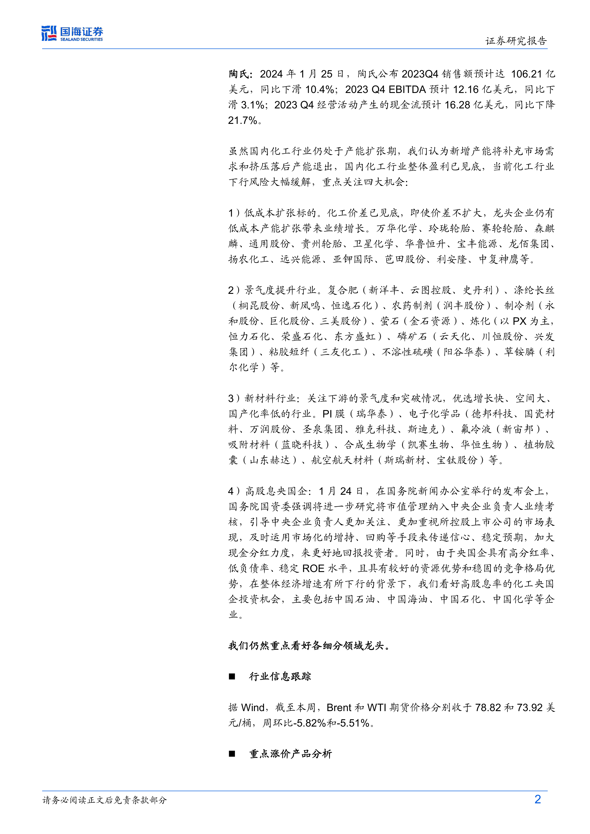 4)高股息央国企:1月24日,在国务院新闻办公室举行的发布会上,国务院国资委强调将进一步研究将市值管理纳入中央企业负责人业绩考核,引导中央企业负责人更加关注、更加重视所控股上市公司的市场表现,及时运用市场化的增持、回购等手段来传递信心、稳定预期,加大现金分红力度,来更好地回报投资者。同时,由于央国企具有高分红率、低负债率、稳定ROE水平,且具有较好的资源优势和稳固的竞争格局优势,在整体经济增速有所下行的背景下,我们看好高股息率的化工央国企投资机会,主要包括中国石油、中国海油、中国石化、中国化学等企业。