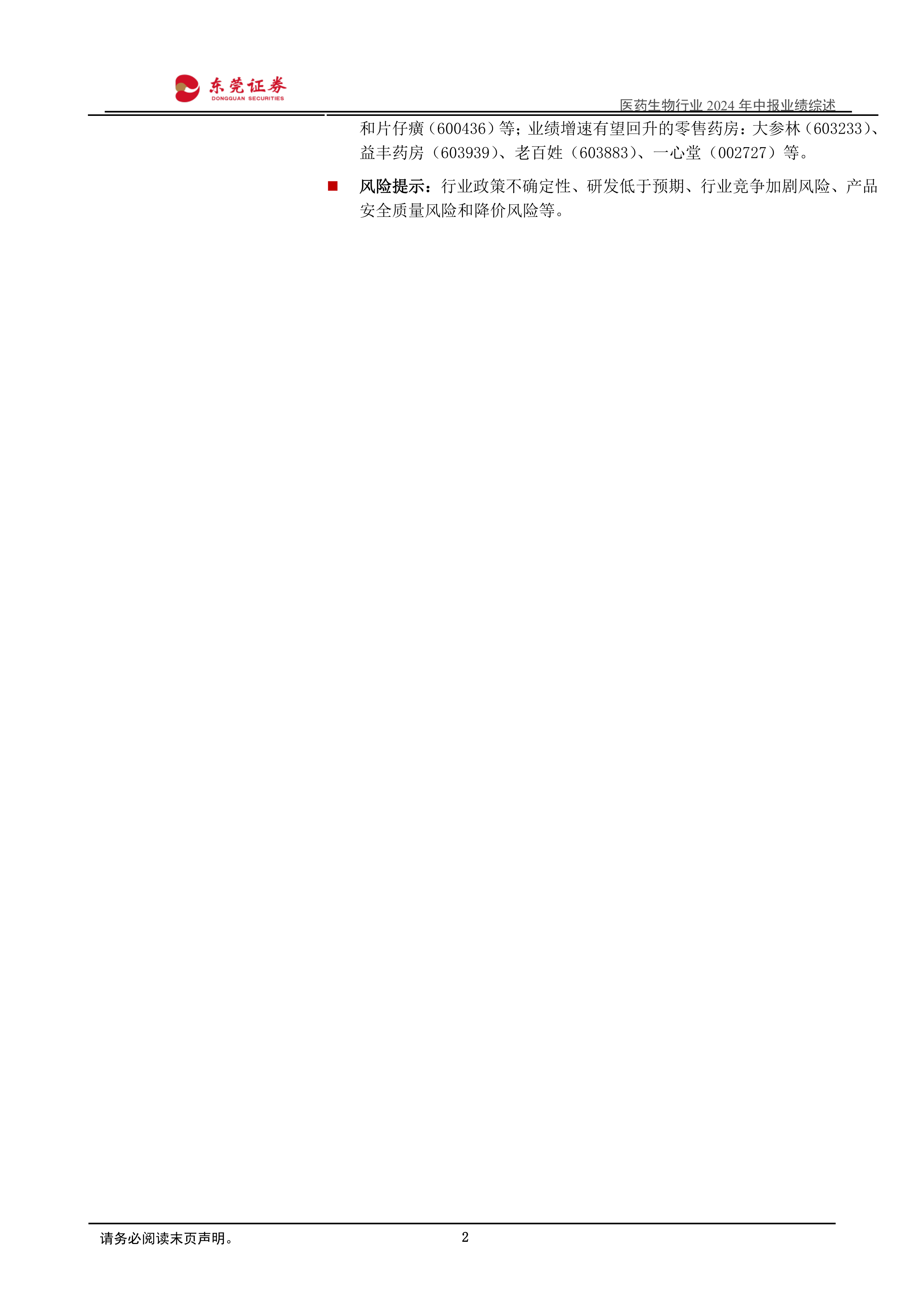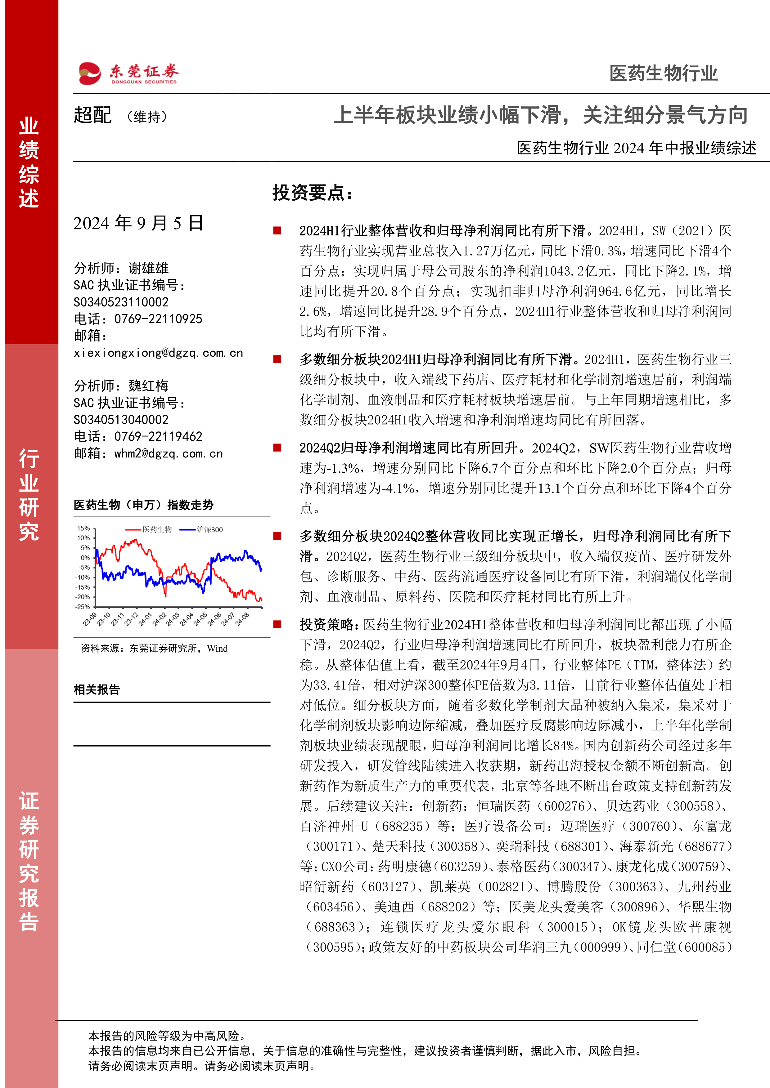 投资策略:医药生物行业2024H1整体营收和归母净利润同比都出现了小幅下滑,2024Q2,行业归母净利润增速同比有所回升,板块盈利能力有所企稳。从整体估值上看,截至2024年9月4日,行业整体PE(TTM,整体法)约为33.41倍,相对沪深300整体PE倍数为3.11倍,目前行业整体估值处于相对低位。细分板块方面,随着多数化学制剂大品种被纳入集采,集采对于化学制剂板块影响边际缩减,叠加医疗反腐影响边际减小,上半年化学制剂板块业绩表现靓眼,归母净利润同比增长84%。国内创新药公司经过多年研发投入,研发管线陆续进入收获期,新药出海授权金额不断创新高。创新药作为新质生产力的重要代表,北京等各地不断出台政策支持创新药发展。后续建议关注:创新药:恒瑞医药(600276)、贝达药业(300558)、百济神州-U(688235)等;医疗设备公司:迈瑞医疗(300760)、东富龙(300171)、楚天科技(300358)、奕瑞科技(688301)、海泰新光(688677等;CXO公司:药明康德(603259)、泰格医药(300347)、康龙化成(300759)昭衍新药(603127)、凯莱英(002821)、博腾股份(300363)、九州药业(603456)、美迪西(688202)等;医美龙头爱美客(300896)、华熙生物(688363);连锁医疗龙头爱尔眼科(300015);OK镜龙头欧普康视(300595);政策友好的中药板块公司华润三九(000999)、同仁堂(600085和片仔癀(600436)等;业绩增速有望回升的零售药房:大参林(603233)益丰药房(603939)、老百姓(603883)、一心堂(002727)等。