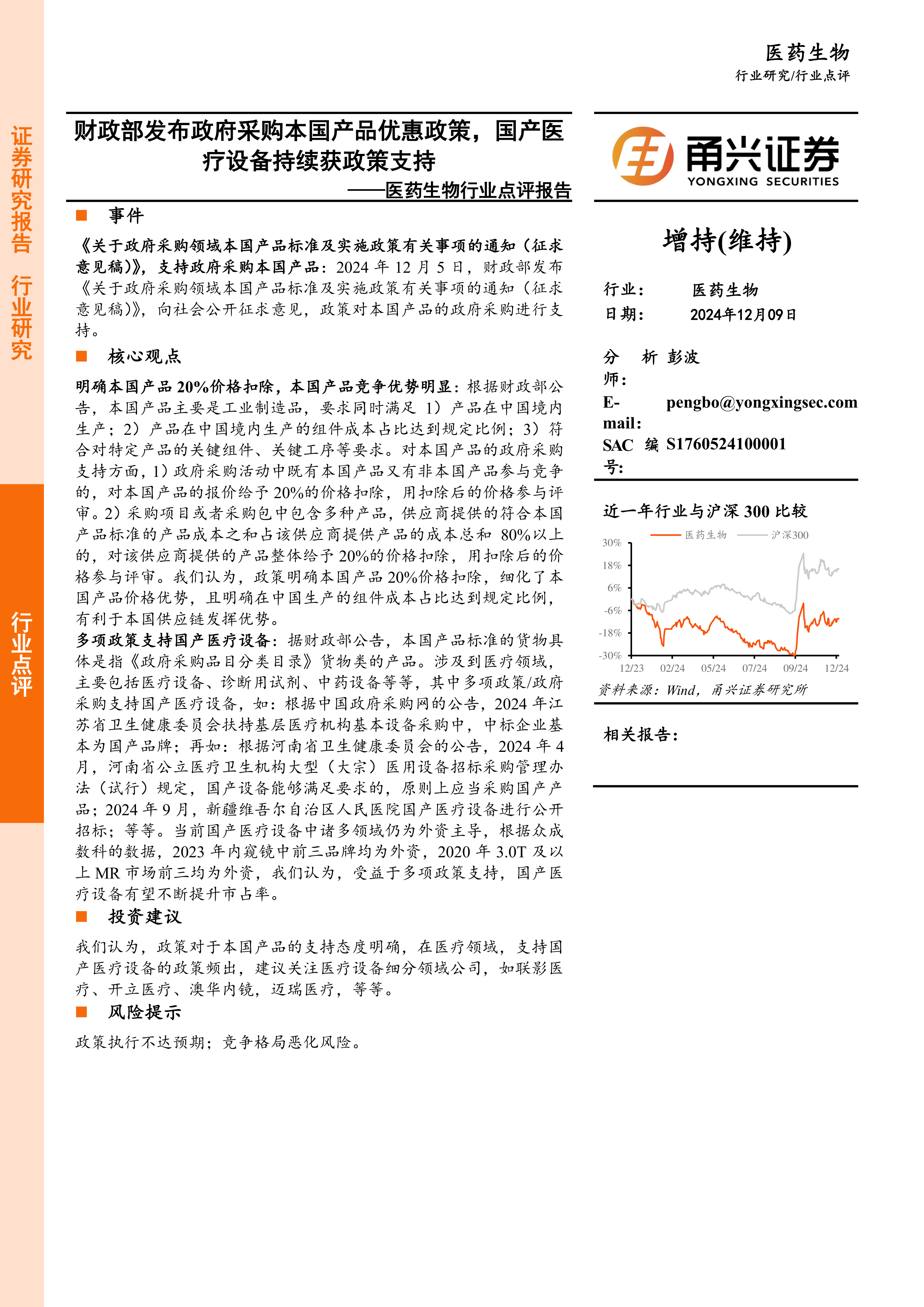医药生物行业点评报告:财政部发布政府采购本国产品优惠政策,国产医疗设备持续获政策支持
