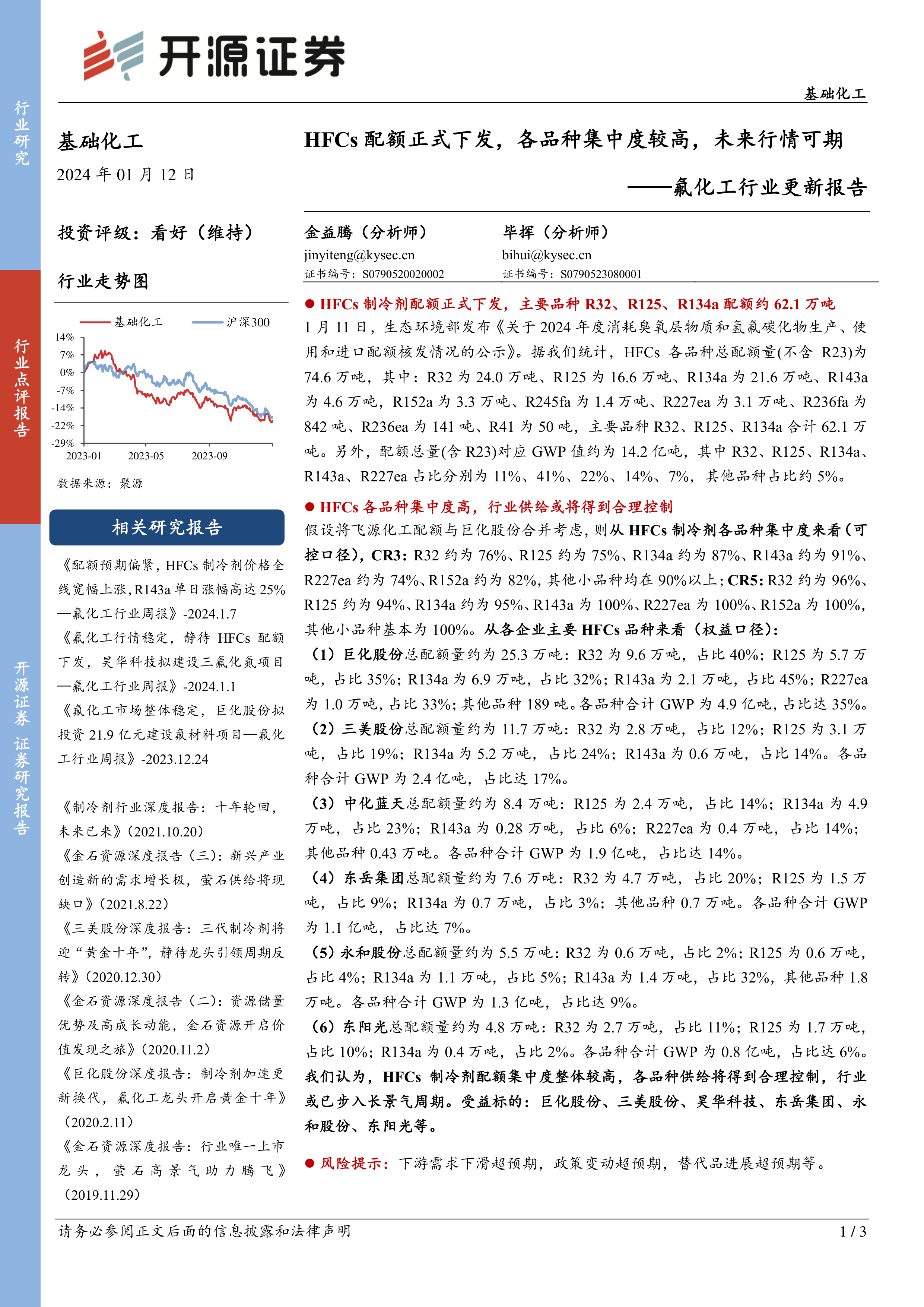 基础化工氟化工行业更新报告:HFCs配额正式下发,各品种集中度较高,未来行情可期