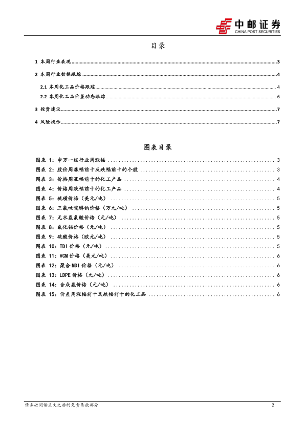 化工新材料行业周报:本周硫磺、无水氢氟酸价格涨幅居前,TDI、MDI价格跌幅较大