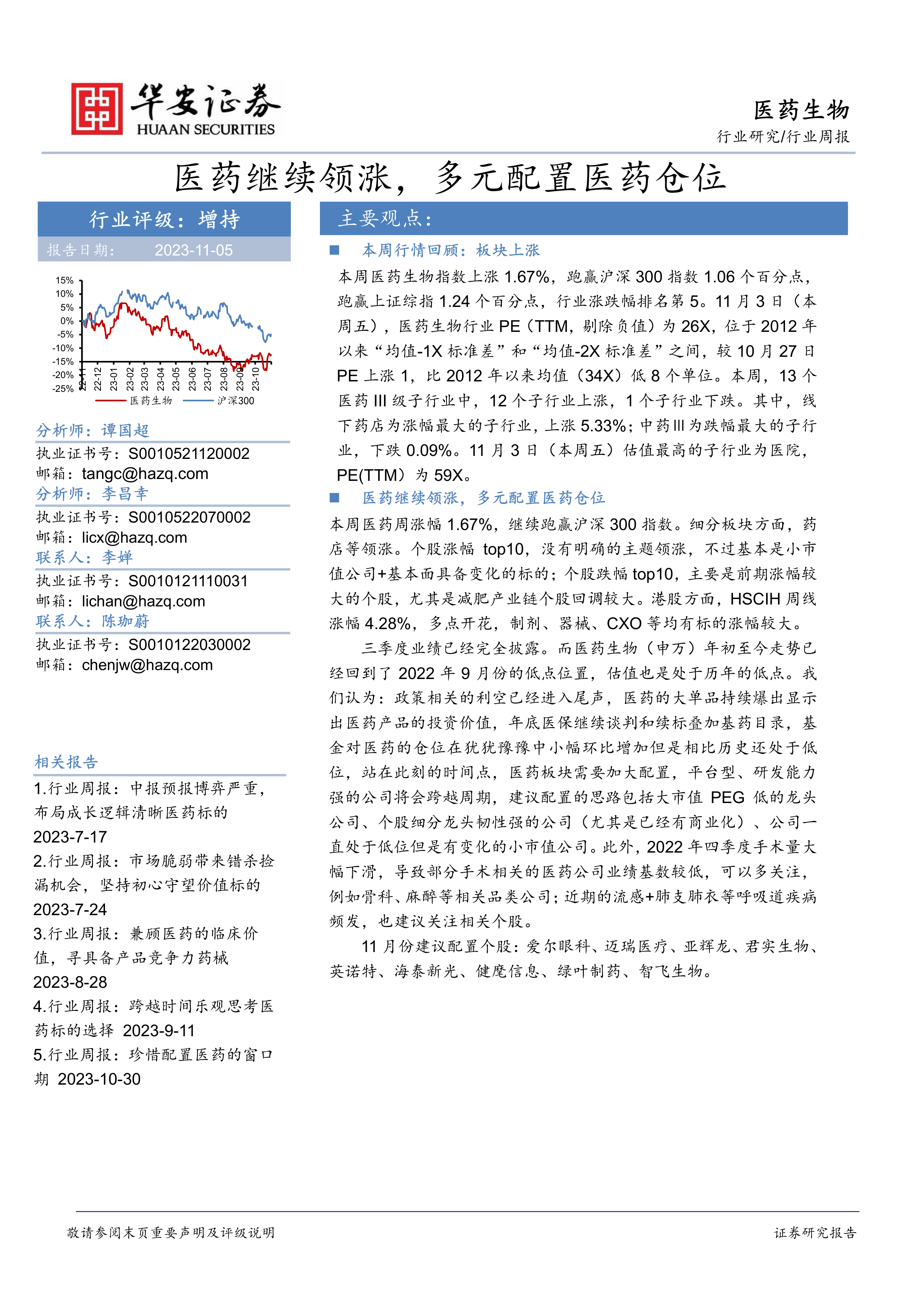 公司点评艾迪药业(688488 ):《Q3 已过医保催化将近,蓄力医保内销售放量》;公司点评君实生物-U (688180.SH ):《Q3 维持产品销售增长,FDA 正式批准拓益出海》;公司点评亚辉龙(688575):《收入利润超预期, 装机持续高增速》 ; 公司点评三星医疗(601567) :《利润亮眼,康复医疗与智能电表业务同步发展》;持仓分析:《2023Q3医药持仓稳步上升, 医疗服务仓位增加》 ; 公司点评英诺特(688253) :《流感已成趋势,看好公司 POCT 联检产品放量》;公司点评信立泰(002294.SZ):《年底医保谈判将近,着眼长期创新稳步推进》;公司点评药康生物(688046):《毛利率逐步改善,产能建设有序推进》;公司点评昭衍新药(603127):《表观业绩短期承压,新签订单略有波动》;公司点评东亚药业(605177):《毛利率环比改善,看好盈利能力持续修复》。