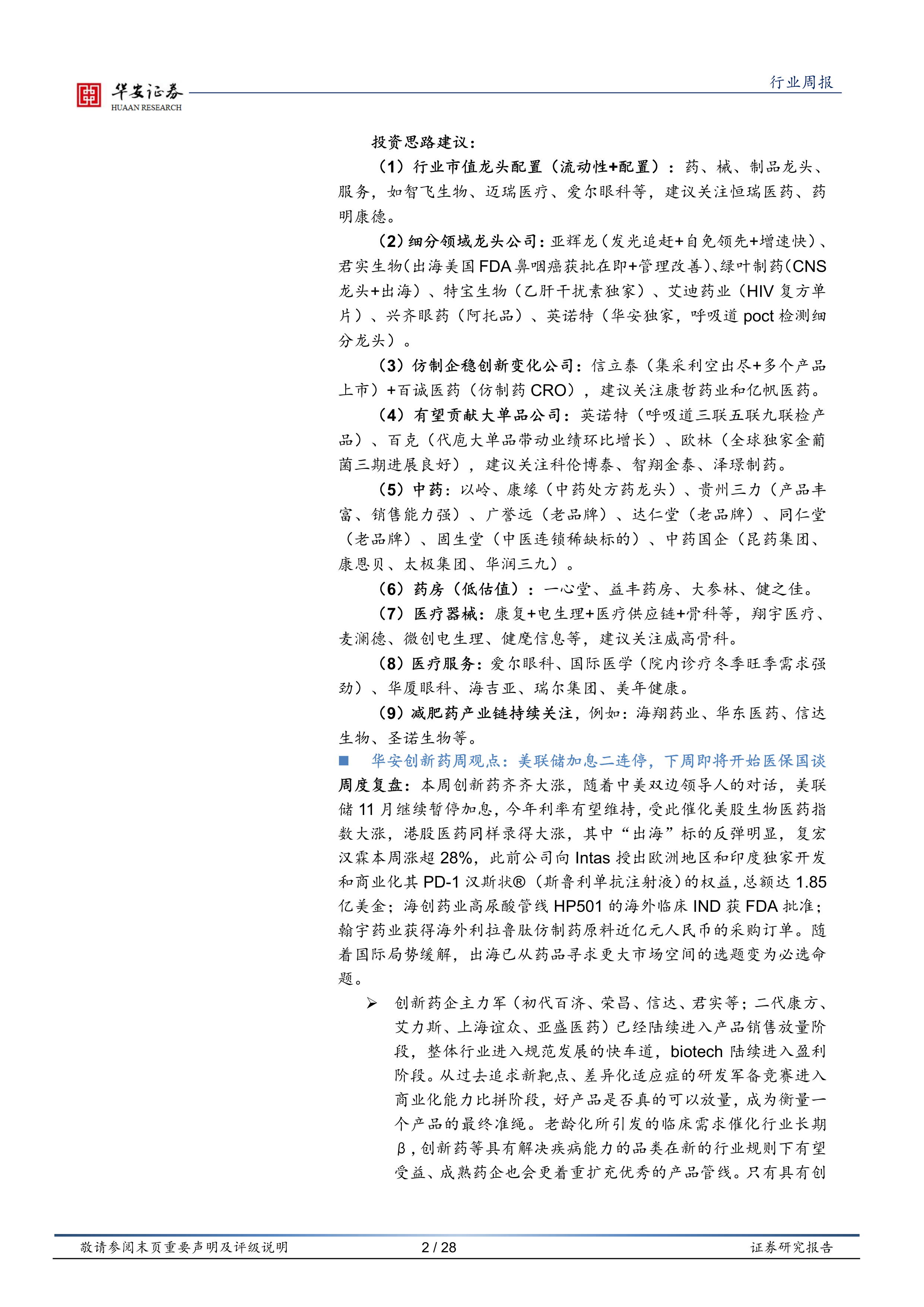 ( 1)行业市值龙头配置(流动性+配置): 药、械、制品龙头、服务,如智飞生物、迈瑞医疗、爱尔眼科等,建议关注恒瑞医药、药明康德。( 2) 细分领域龙头公司: 亚辉龙(发光追赶+自免领先+增速快) 、君实生物(出海美国 FDA 鼻咽癌获批在即+管理改善)、绿叶制药( CNS龙头+出海)、特宝生物(乙肝干扰素独家)、艾迪药业( HIV 复方单片)、兴齐眼药(阿托品)、英诺特(华安独家,呼吸道 poct 检测细分龙头)。( 3)仿制企稳创新变化公司: 信立泰(集采利空出尽+多个产品上市) +百诚医药(仿制药 CRO),建议关注康哲药业和亿帆医药。( 4)有望贡献大单品公司: 英诺特(呼吸道三联五联九联检产品)、百克(代庖大单品带动业绩环比增长)、欧林(全球独家金葡菌三期进展良好),建议关注科伦博泰、智翔金泰、泽璟制药。( 5)中药:以岭、康缘(中药处方药龙头)、贵州三力(产品丰富、销售能力强)、广誉远(老品牌)、达仁堂(老品牌)、同仁堂(老品牌)、固生堂(中医连锁稀缺标的)、中药国企(昆药集团、康恩贝、太极集团、华润三九)。