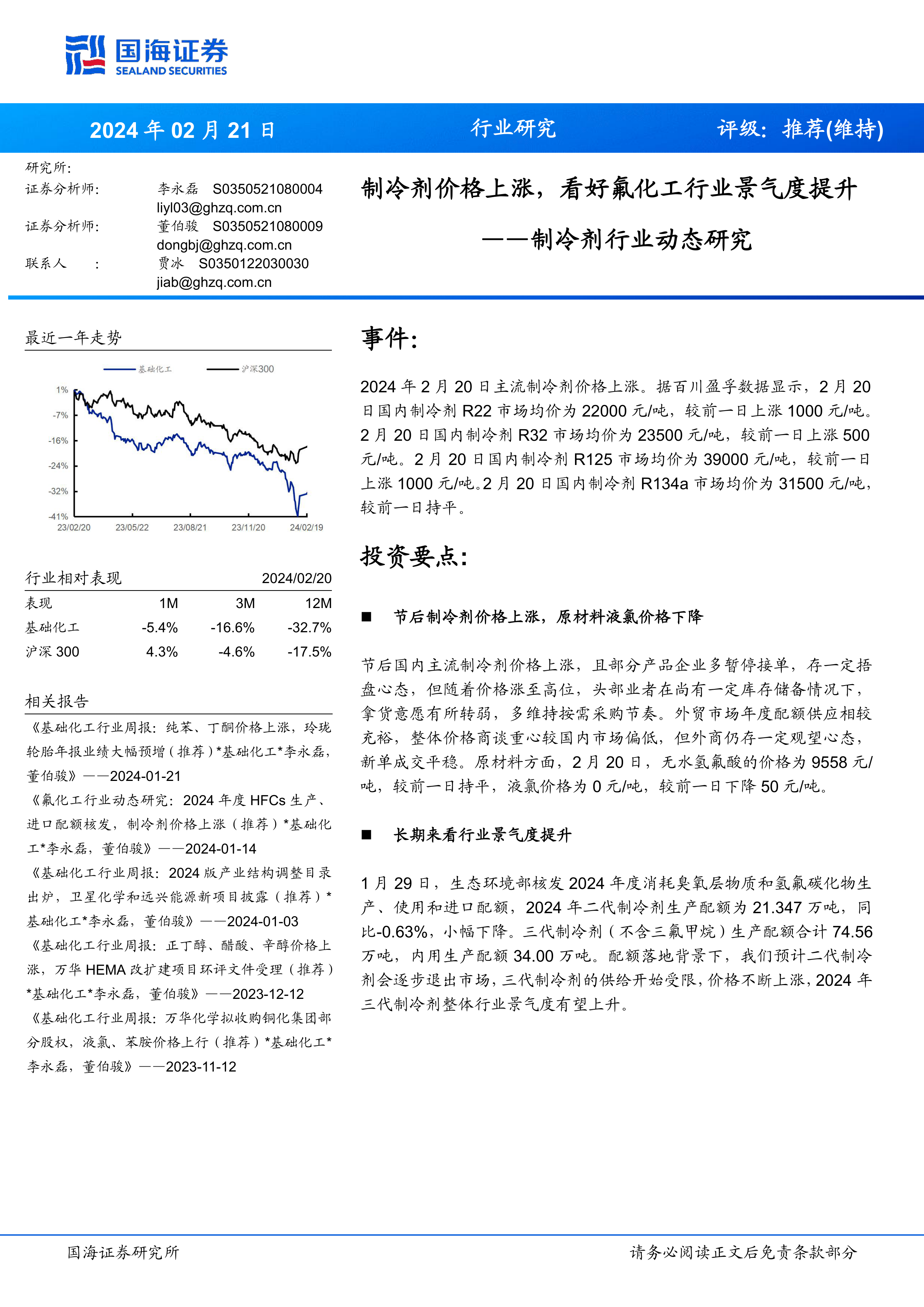制冷剂行业动态研究:制冷剂价格上涨,看好氟化工行业景气度提升