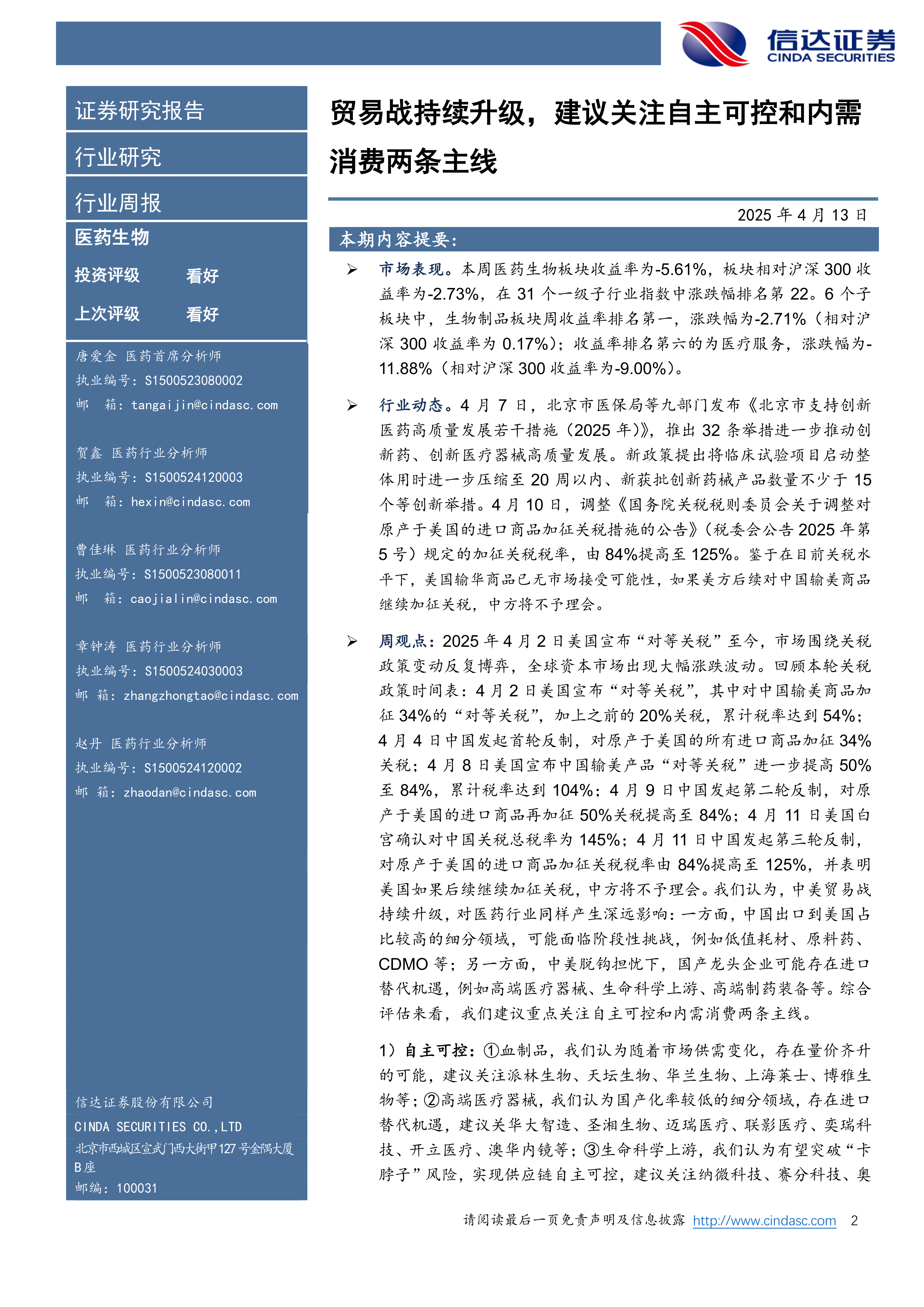 周观点:2025年4月2日美国宣布“对等关税”至今,市场围绕关税政策变动反复博弈,全球资本市场出现大幅涨跌波动。回顾本轮关税政策时间表:4月2日美国宣布“对等关税”,其中对中国输美商品加征34%的“对等关税”,加上之前的20%关税,累计税率达到54%;4月4日中国发起首轮反制,对原产于美国的所有进口商品加征34%关税;4月8日美国宣布中国输美产品“对等关税”进一步提高50%至84%,累计税率达到104%;4月9日中国发起第二轮反制,对原产于美国的进口商品再加征50%关税提高至84%;4月11日美国白宫确认对中国关税总税率为145%;4月11日中国发起第三轮反制,对原产于美国的进口商品加征关税税率由84%提高至125%,并表明美国如果后续继续加征关税,中方将不予理会。我们认为,中美贸易战持续升级,对医药行业同样产生深远影响:一方面,中国出口到美国占比较高的细分领域,可能面临阶段性挑战,例如低值耗材、原料药、CDMO等;另一方面,中美脱钩担忧下,国产龙头企业可能存在进口替代机遇,例如高端医疗器械、生命科学上游、高端制药装备等。综合评估来看,我们建议重点关注自主可控和内需消费两条主线。