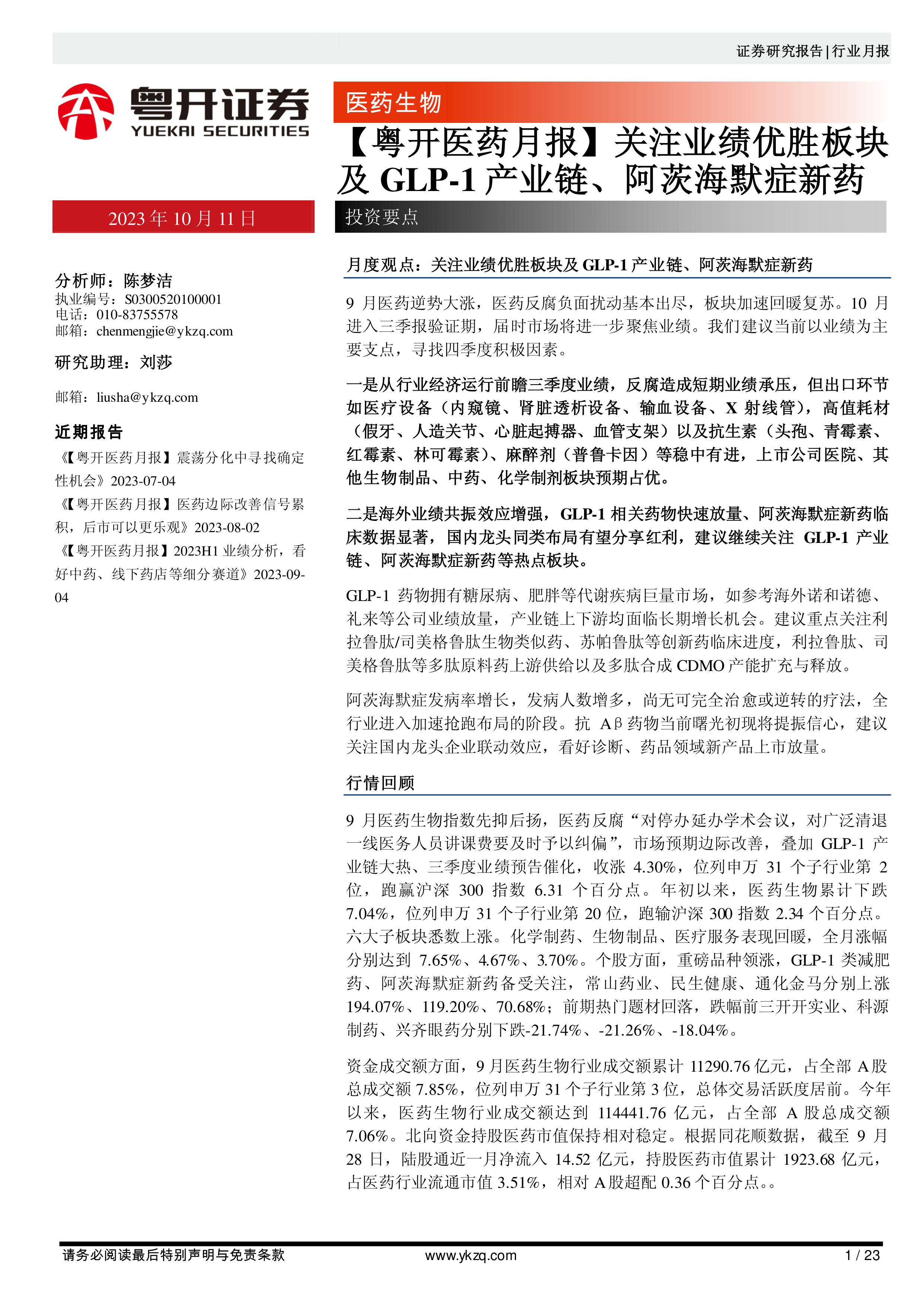 【粤开医药月报】关注业绩优胜板块及GLP-1产业链、阿茨海默症新药