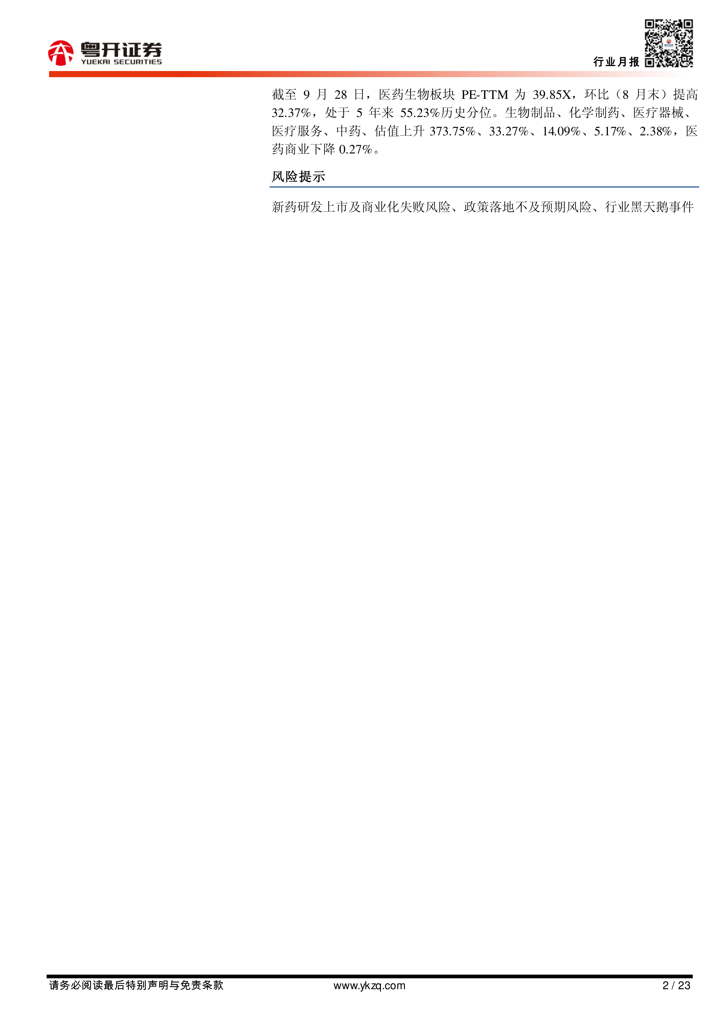 截至9月28日,医药生物板块PE-TTM为39.85X,环比(8月末)提高32.37%,处于5年来55.23%历史分位。生物制品、化学制药、医疗器械、医疗服务、中药、估值上升373.75%、33.27%、14.09%、5.17%、2.38%,医药商业下降0.27%。